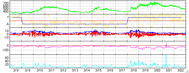 ACEが観測した太陽風の磁場(1番上の枠、白線は全体の強度、赤線は南北成分) および、太陽風の密度(3番目の橙線)、速度(4番目の黄線) (c) NOAA/SEC ![]() リアルタイムAE指数 下段のAEグラフの値が高くなると、オーロラ活動が活発化しています。 (c) 京都大学, NICT ![]() 27日の太陽周期に合わせたデータプロット (太陽風版) 太陽が同じ面を地球に向けていた27日前の変化から、今後を予想することができます。 (c) NICT