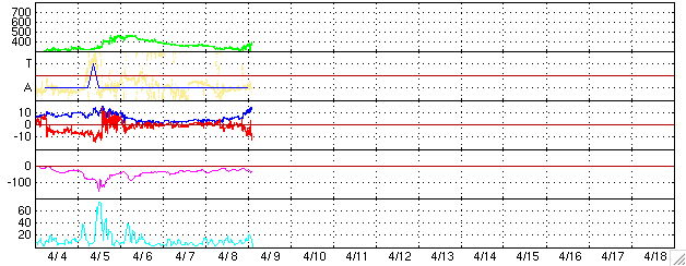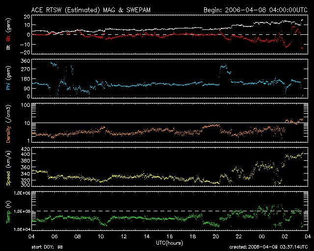 2006/ 4/ 9 12:38 更新 太陽風速度の上昇が始まりました。強い南向き磁場の影響で、オーロラ活動が発生しています。 担当 篠原 コロナホールによる高速太陽風が、地球にやってきたようです。 ACE衛星の図を見ると、磁場強度(白線)が、 最初は4nTでしたが、ゆっくりと強まり続けて15nTにまで強まっています。 この様な磁場強度の強まりは、高速風の始まりによく見られます。 磁場強度の変化に続いて、速度(黄色線)にも変化が現れています。 まだ小幅ですが、320km/秒から400km/秒へと上昇しています。 引き続き速度は上昇を続けると思われますので、注意してください。 磁場強度が強まった事で、南北成分(赤線)の影響も大きくなっています。 磁場強度が強いために、強い南向きが発生しやすくなるのです。 今日のACEの図の最後の部分では、 -5〜-10nTくらいの南向きが6時間にわたって続いています。 このため、オーロラ活動が急に活発化しています。 AE指数で1000nTの変化が観測されています。 ACEの図の最新部分を見ると、 一度北向きに切り替わって、また南に下がるという変化が見えています。 このまま南向きが続くと、オーロラ活動も活発に続きます。 SOHO EIT284の太陽写真には、高速風の原因となるコロナホールが見えています。 東西方向(横方向)の幅が広くありませんので、 高速風は2〜3日程度の短い期間で終わるのではないでしょうか。 急に複数の黒点群が発生して、にぎやかになった太陽面でしたが、 これらの黒点群は西に没しつつあります。 活動も穏やかになっていて、フレア活動は観測されていません。 太陽の中心付近に869黒点群が残っていますが、これも小規模です。 太陽は穏やかになっています。 SOHO衛星のEIT284カメラの映像 (c) SOHO (ESA & NASA)