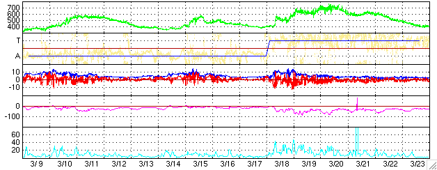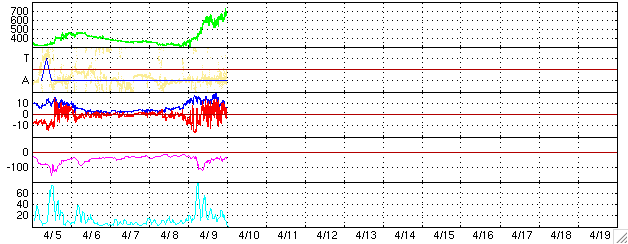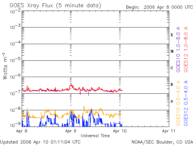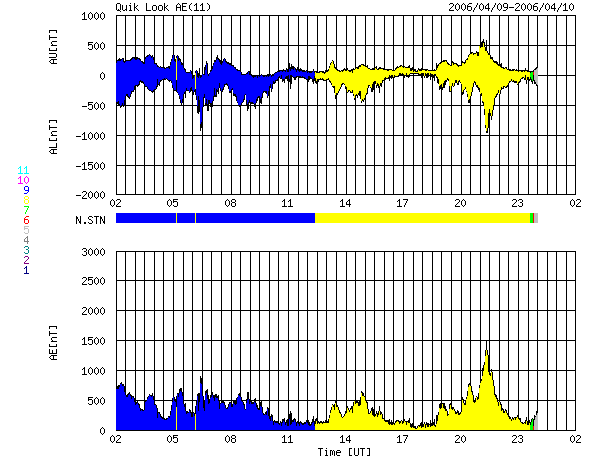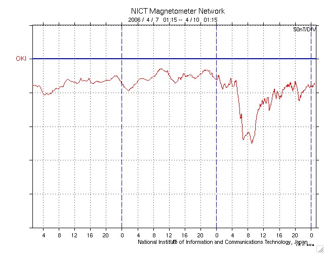 下段のAEグラフの値が高くなると、オーロラ活動が活発化しています。 (c) 京都大学, NICT ![]() 沖縄の磁場擾乱 下へ下がるほど、擾乱が発達している事を意味します。 (c) NICT ![]() SOHO衛星のMDIカメラによる太陽黒点 (c) SOHO (ESA & NASA) ![]() GOES衛星の太陽X線データ (c) NOAA/SEC ![]() | ||||||||||||||||||||||||||||||||||||||||||||||||||||||||