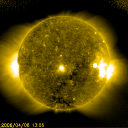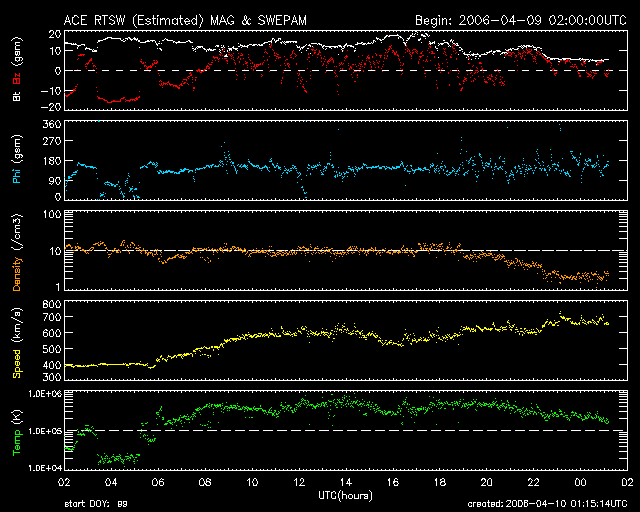 2006/ 4/10 10:15 更新 磁気圏活動が活発になっています。小規模の磁気嵐になっています。太陽風の速度は680km/秒に上昇しています。 担当 篠原 昨日のニュース以降、太陽風の速度は上昇を続け、 9日20時(世界時9日11時)頃に600km/秒、 10日9時(世界時10日0時)には680km/秒に上がっています。 コロナホールの見え方や、27日周期の前周期の変化などと比べて考えると、 予想以上に高速になったと思います。 27日周期の図の、4月9日の部分を見ていただきたいのですが、 高速風が到来する(速度(緑色線)が上昇する)前には、 磁場強度(青線)が先に強まるという性質があります。 今回の高速風でも、磁場強度は15〜20nTへ強まっています。 この様な時に、南向き磁場(赤線)も強いものが現れやすくなり、 速度の上昇と重なって強い磁気圏活動を起こしやすくなります。 今回も、オーロラ活動を示すAE指数で 500〜1000nT(最大は1500nT)規模の活動がここまで続いています。 また、ACEの図の赤線で、9日12時半から14時半(世界時9日3時半から5時半)にかけて -15nTに達する強い南向き磁場が見られています。 この影響で沖縄の磁場強度が一気に100nT近く下がる現象が観測されています。 地球を囲むように流れる環電流の急な発達を示しています。 世界規模の観測でも小さな磁気嵐となっているようです(Dst指数で-50nT)。 ACE衛星の図を見ると、太陽風の磁場強度は5nTへ弱まっています。 このことより、既に速度は最大に達していると思われます。 磁場強度が下がったことで、強い南向きは発生しなくなっています。 しかし、速度が高まっていますから、弱い南向きでも影響は大きくなります。 (速度と南向き磁場強度の重ね合わせで、磁気圏への影響が決まります) 高速風が続いている間は、磁気圏活動への注意が必要です。 コロナホールの規模から考えると、この高速風はそれほど続かないと思われます。 これからゆっくり低下を始め、明日にかけて下がって行くのではないでしょうか。 太陽のフレア活動は、静穏です。 太陽写真の東端(左端)に、小さく黒点が見えています。 規模も小さく、X線の動画を見ても目立った活動は起こしていません。 太陽は穏やかな状態が続くでしょう。 SOHO衛星のEIT284カメラの映像 (c) SOHO (ESA & NASA)