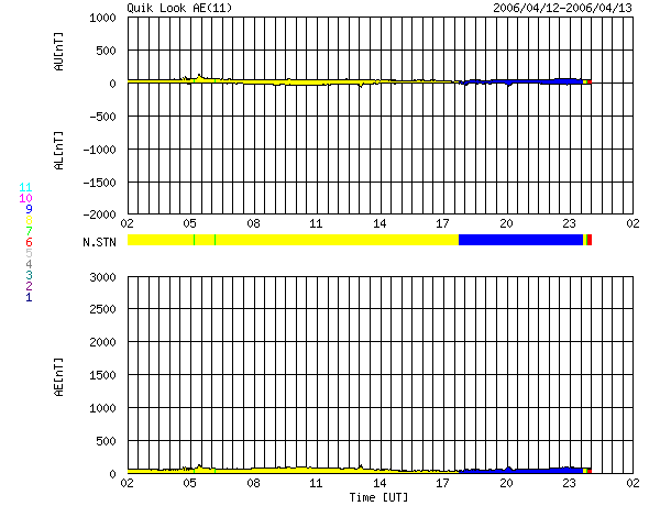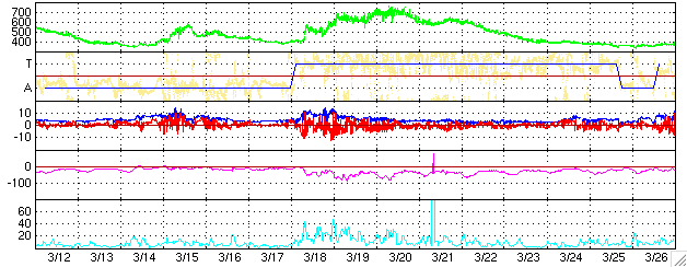 ACEが観測した太陽風の磁場(1番上の枠、白線は全体の強度、赤線は南北成分) および、太陽風の密度(3番目の橙線)、速度(4番目の黄線) (c) NOAA/SEC ![]() リアルタイムAE指数 下段のAEグラフの値が高くなると、オーロラ活動が活発化しています。 (c) 京都大学, NICT ![]() 27日の太陽周期に合わせたデータプロット (太陽風版) 太陽が同じ面を地球に向けていた27日前の変化から、今後を予想することができます。 (c) NICT