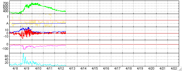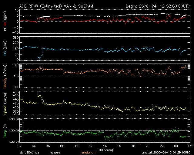 2006/ 4/13 10:30 更新 太陽風の速度は400km/秒で普通の速さです。磁気圏は穏やかです。 担当 篠原 太陽風の速度(ACEの黄色線)は、昨日の450km/秒から、400km/秒へ下がった所で安定しています。 磁場強度(白線)も、5nTでほぼ一定しています。 南北成分(赤線)は小さく、0nT付近にあるか、時おり+3nT程度北寄りに振れています。 このため、磁気圏へのエネルギーの流れ込みは小さくなり、 オーロラなどの磁気圏活動はたいへん小さくなっています。 AE指数には全く変化が観測されていません。 ここ数日お知らせして来たように、コロナホールが太陽の中心を横切り、 まもなく、ここからの高速太陽風が地球へやってきます。 今日のSOHO EIT284写真を見ると、 太陽の真ん中から北側(上側)にかけて、暗くコロナホールが広がっています。 今、まさに高速風の本体が地球に向かって放出されていると言えます。 飛び出した太陽風は、約3日かけて地球へやってきます。 さて、その高速風の先陣が、これから明日(15日)くらいに地球へ到達すると予想されます。 速度の上昇に先立って、太陽風の磁場に乱れが発生します。 27日周期の図を見てください。 前周期の3月18-19日に、太陽風の速度(緑色線)が上昇していますが、 その始まりの部分、3月18日に太陽風磁場が強まり、乱れが発生しています(青線と赤線)。 これと同様の変化が、これから発生すると思われます。 ACEデータの速度(黄色線)とともに、磁場強度(白線)の変化にも注目してください。 磁場強度が強まると、強い南向きが発生しやすくなります。 速度の上昇につれて、オーロラの活動が活発になったり磁気嵐が発生します。 放射線帯の高エネルギー電子は、やや高いレベルを保っています。 警戒ラインと言われる10の4乗の線は下回っていますが、 昨日からは、ほとんど減少していません。 ただ、今後、太陽風が乱れて磁気圏活動が発生すると、一気に減少するでしょう。 太陽では、黒点群がずらっとならんで、にぎやかです。 規模はどれも小さく、目立ったフレア活動も起こしていません。 太陽は穏やかな状態です。 SOHO衛星のEIT284カメラの映像 (c) SOHO (ESA & NASA)