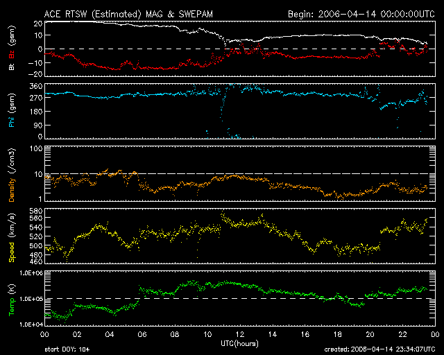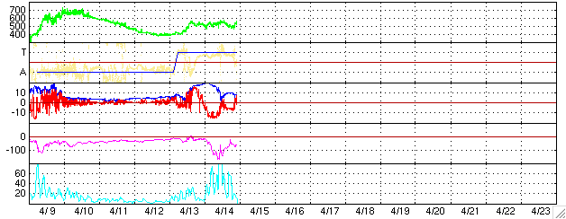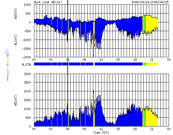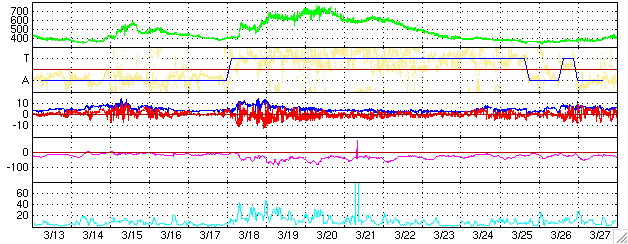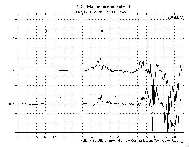 ACEが観測した太陽風の磁場(1番上の枠、白線は全体の強度、赤線は南北成分) および、太陽風の密度(3番目の橙線)、速度(4番目の黄線) (c) NOAA/SEC ![]() リアルタイムAE指数 下段のAEグラフの値が高くなると、オーロラ活動が活発化しています。 (c) 京都大学, NICT ![]() シベリアで観測された3日間の磁場データ 右側の3分の1が、昨日のデータになります。グラフが上がったり下がったりすると、オーロラ活動が活発化しています。 (c) NICT ![]() 沖縄の磁場擾乱 下へ下がるほど、擾乱が発達している事を意味します。 (c) NICT ![]() 27日の太陽周期に合わせたデータプロット (太陽風版) 太陽が同じ面を地球に向けていた27日前の変化から、今後を予想することができます。 (c) NICT