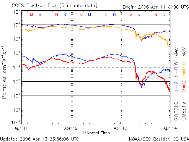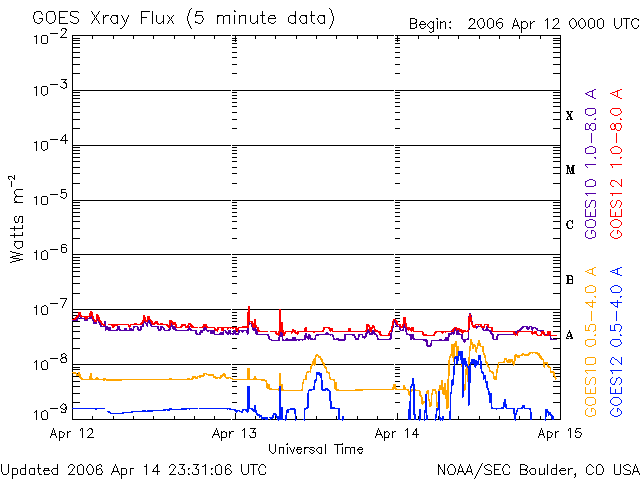 (c) NOAA/SEC ![]() GOES衛星の太陽X線データ (c) NOAA/SEC ![]() SOHO衛星のMDIカメラによる太陽黒点 (c) SOHO (ESA & NASA) ![]() | ||||||||||||||||||||||||||||||||||||||||||||||||||||||||