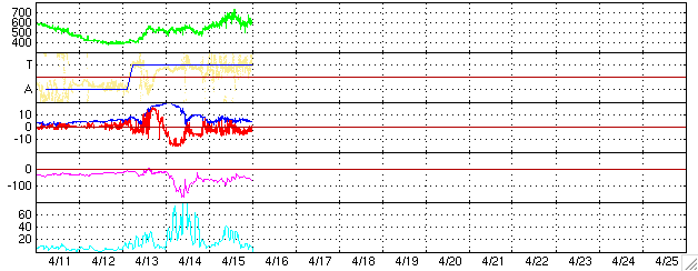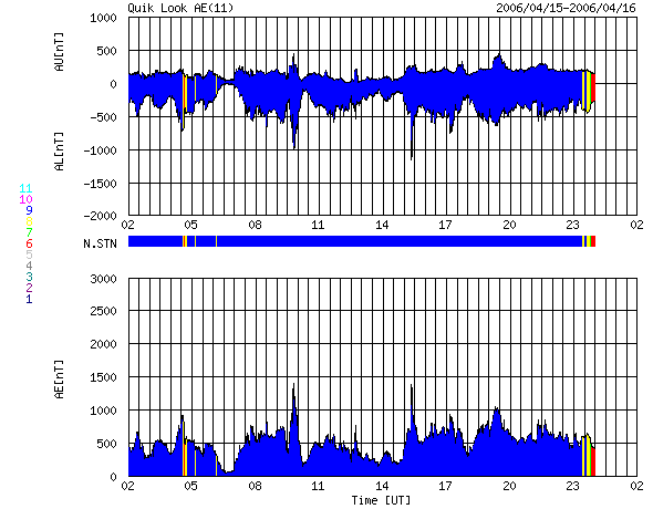 ACEが観測した太陽風の磁場(1番上の枠、白線は全体の強度、赤線は南北成分) および、太陽風の密度(3番目の橙線)、速度(4番目の黄線) (c) NOAA/SEC ![]() リアルタイムAE指数 下段のAEグラフの値が高くなると、オーロラ活動が活発化しています。 (c) 京都大学, NICT ![]() 沖縄の磁場擾乱 下へ下がるほど、擾乱が発達している事を意味します。 (c) NICT ![]() 27日の太陽周期に合わせたデータプロット (太陽風版) 太陽が同じ面を地球に向けていた27日前の変化から、今後を予想することができます。 (c) NICT
