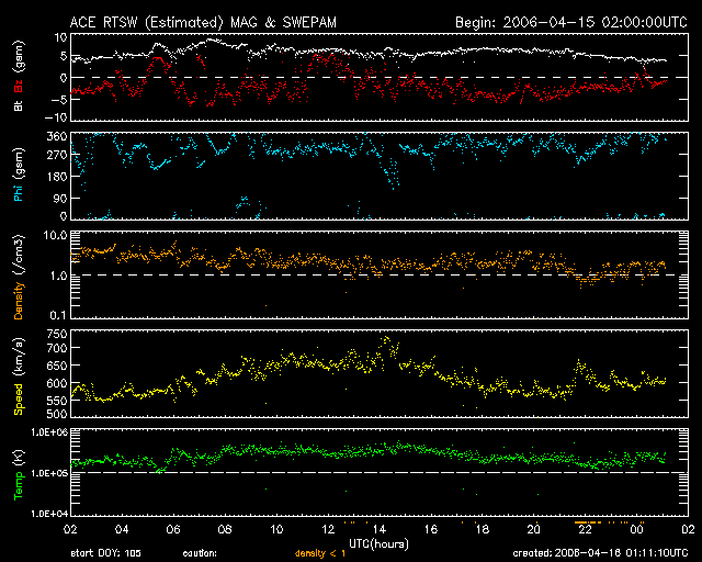 2006/ 4/16 10:13 更新 高速の太陽風が続いています(650km/秒)。オーロラ活動も活発な状態が続いています。 担当 篠原 高速の太陽風が続いています。 昨日より速度は上昇して、600〜650km/秒の間で推移しています。 SOHO EIT284の太陽写真に見える、コロナホールの影響が続いています。 (今日掲載のSOHO写真は、1日古い写真です) 磁場強度は5〜6nT。 ACEの図の全体で、南寄りの傾向が続いています。 速度が高まっているため、磁気圏のオーロラ活動も活発に続いています。 AE指数では、500〜1000nTの変動が、1日通して観測されています。 一方、14日に発生した中規模の磁気嵐は、 太陽風磁場の南向きが落ち着いた以降は発達は終わり、ゆっくりと減衰の傾向になっています。 沖縄の磁場データは、静穏レベルから-50nTのところを前後しています。 SOHOの写真では、コロナホールの終わり(左端)が、太陽の中心に達しています。 この写真は1日古いので、それを加味すると、 もう2日ほどこのコロナホールの影響が続きそうです。 引き続き、現在の様な活発な磁気圏活動が見られる可能性があります。 太陽風磁場の南向き傾向が続くと、オーロラ活動も継続します。 放射線帯の高エネルギー電子は一段と増大しています。 青線のGOES10は10の5乗にまで達し、 赤線のGOES12も警戒ラインの10の4乗に達しています。 高速太陽風が続いていますので、今後の変化に引き続き注意してください。 太陽のフレア活動は穏やかです。 黒点群は全体的に減少していて、太陽面はまた寂しくなってきています。 SOHO衛星のEIT284カメラの映像 (c) SOHO (ESA & NASA)