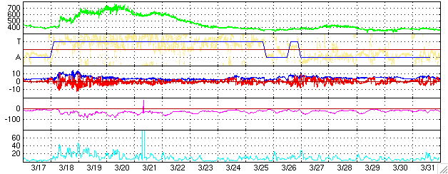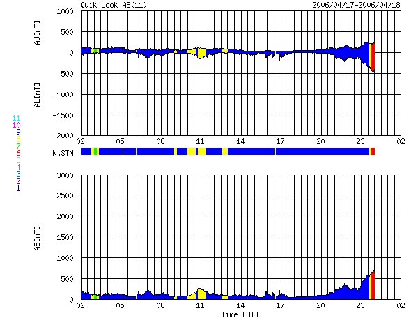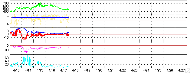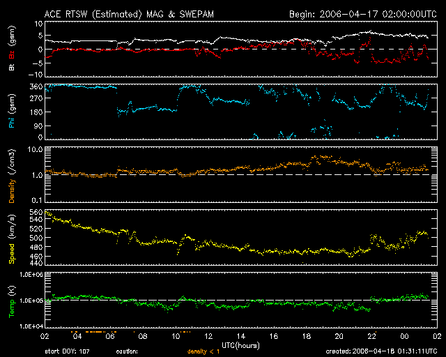 GOES衛星による、静止衛星軌道における高エネルギー電子の変化 (c) NOAA/SEC ![]() ACEが観測した太陽風の磁場(1番上の枠、白線は全体の強度、赤線は南北成分) および、太陽風の密度(3番目の橙線)、速度(4番目の黄線) (c) NOAA/SEC ![]() リアルタイムAE指数 下段のAEグラフの値が高くなると、オーロラ活動が活発化しています。 (c) 京都大学, NICT ![]() 27日の太陽周期に合わせたデータプロット (太陽風版) 太陽が同じ面を地球に向けていた27日前の変化から、今後を予想することができます。 (c) NICT