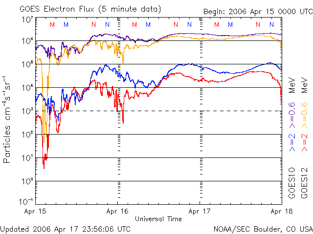 2006/ 4/18 10:33 更新 放射線帯の高エネルギー電子は高いレベルを続けています。太陽風はやや高速です(500km/秒)。 担当 篠原 放射線帯の高エネルギー電子は、たいへん高いレベルを続けています。 昨夜も、GOES10の観測値は10の5乗を越えていました。 衛星の運用では注意が必要な状態です。 ただし、観測データの最新の部分では急激な減少が見られています (リアルタイムの図では、掲載している図以上に減少が見られています)。 これが高エネルギー電子の本格的な減少を意味しているのか、瞬間的な変化に留まるのか、 明日にかけてデータの変化に注目する必要があります。 ACEの観測によると、太陽風磁場が-5nTと南寄りの傾向になっています。 このため、磁気圏の活動が活発になっている様です。 AE指数で700nTの変化が見えています。 放射線帯高エネルギー電子の急減は、この磁気圏活動と関係した変化だと思われます。 太陽風は順調に速度を下げています。 昨日550km/秒を切ったとお知らせしましたが、 18日0時(世界時17日15時)頃に470km/秒までさがりました。 一旦そこで落ち着き、最新の部分で500km/秒へやや上がっています。 これと関係するように、太陽風の磁場強度が、 速度の上昇が発生する少し前から5nTと少しですが強まりを見せています (それまでは、3nT前後で推移していました)。 この様子では、もう少し速度が上がるのかもしれません。 ただ、対応するコロナホールは見えていませんので、上昇しても小規模でしょう。 SOHO EIT284カメラでは、太陽の中心のやや北(上)に、 ぽつんと小さなコロナホールが見えています。 27日前の、太陽の同じ面が見えていた時の写真と比較してみます。 このところ黒点がにぎやかに活動していましたが、その影響でしょうか、 明るい活動領域(黒点があります)が赤道沿いに東西に分布しています。 前周期は南北に細長く延びていたコロナホールが、南半分が消えてしまって、 北の端の部分だけが残ったようになっています。 ただ、コロナホールの幅は大きくなっています。 前周期の太陽風の変化では、このコロナホールによ影響はあまり見られませんでした。 (3月25日以降に磁場の乱れがある程度見えています) 今回は、コロナホールの様子が変わっていますので、影響の及び方も変わりそうです。 北側だけが残ったということでは、影響は小さくなる方向ですし、 幅が大きくなったということでは、影響は及びやすくなっています。 これから2〜3日後の変化を見てください。 太陽のフレア活動は静穏です。 X線の図でとても小さなフレアが見えていますが、黒点群はどれも小規模で、 今後大きな活動に繋がることはないでしょう。 SOHO衛星のEIT284カメラの映像 (c) SOHO (ESA & NASA)