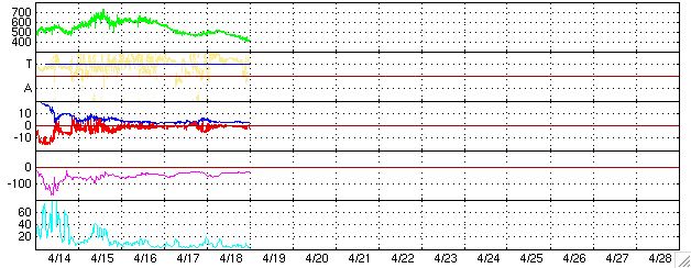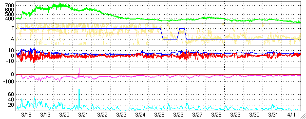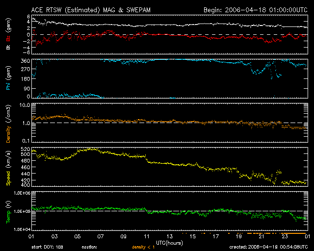 GOES衛星による、静止衛星軌道における高エネルギー電子の変化 (c) NOAA/SEC ![]() リアルタイムAE指数 下段のAEグラフの値が高くなると、オーロラ活動が活発化しています。 (c) 京都大学, NICT ![]() ACEが観測した太陽風の磁場(1番上の枠、白線は全体の強度、赤線は南北成分) および、太陽風の密度(3番目の橙線)、速度(4番目の黄線) (c) NOAA/SEC ![]() 27日の太陽周期に合わせたデータプロット (太陽風版) 太陽が同じ面を地球に向けていた27日前の変化から、今後を予想することができます。 (c) NICT