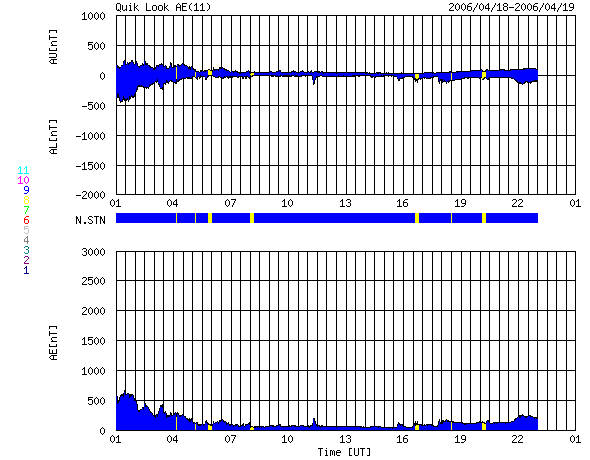 2006/ 4/19 09:56 更新 放射線帯の高エネルギー電子は減少したものの、まだ高いレベルです。太陽風、磁気圏は穏やかです。 担当 篠原 放射線帯の高エネルギー電子は、 昨日の磁気圏の乱れの影響で、密度が一桁下がりました。 (AE指数の図の最初の、500nTほど変化している活動の影響です) 非常に高いレベルからは下がりましたが、依然10の4乗の警戒レベルを保っています。 衛星の運用などでは引き続き注意が必要でしょう。 高エネルギー電子のレベルはゆっくりと下がって行きます。 もう2〜3日くらい高いレベルが続く可能性があります。 太陽風の速度は低下が続いています。 昨日のニュースで、いくらか上昇するかもしれないと書きましたが、 520km/秒とやや速いレベルが8時間ほど継続したくらいで、 その後は、一定して速度は低下し、現在は400km/秒と普通の状態に戻っています。 磁場強度は3nTで弱め。 南北成分はとても小さく、磁気圏活動は穏やかです。 太陽では、小規模のコロナホールが中心線を過ぎ、 もう1〜2日ほどで地球への影響位置(見かけの位置です)に達します。 前周期に目立った擾乱の実績は無く、 コロナホールの規模が特に大きくなっていることはありませんので、 太陽風が大きく乱れることはないでしょう。 太陽のフレア活動も穏やかです。 黒点群は、番号は付けてあるものの、掲載している写真ではほとんど認識できず、 かなり小規模になっている様です。 今後も穏やかな状態が続くでしょう。 SOHO衛星のEIT284カメラの映像 (c) SOHO (ESA & NASA)