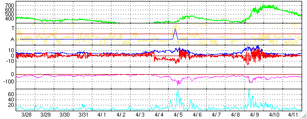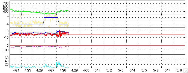 GOES衛星の太陽X線データ (c) NOAA/SEC ![]() SOHO衛星のMDIカメラによる太陽黒点 (c) SOHO (ESA & NASA) ![]() ACEが観測した太陽風の磁場(1番上の枠、白線は全体の強度、赤線は南北成分) および、太陽風の密度(3番目の橙線)、速度(4番目の黄線) (c) NOAA/SEC ![]() リアルタイムAE指数 下段のAEグラフの値が高くなると、オーロラ活動が活発化しています。 (c) 京都大学, NICT ![]() 27日の太陽周期に合わせたデータプロット (太陽風版) 太陽が同じ面を地球に向けていた27日前の変化から、今後を予想することができます。 (c) NICT