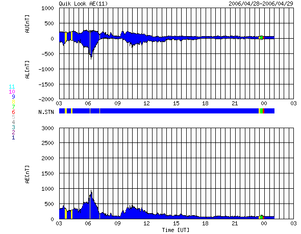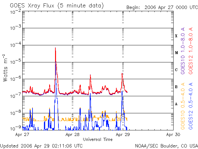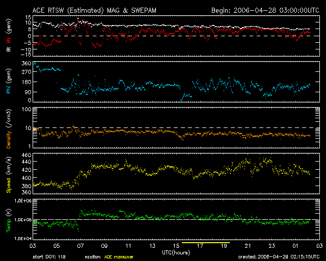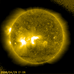 2006/ 4/29 11:18 更新 875黒点群は小規模フレア(C1)を起こしましたが、活動は落ち着いています。 担当 篠原 875黒点群の活動はやや落ち着いて、 28日は17時半(世界時28日8時半)にC1の小さな小規模フレアを起こしただけです。 ただ、黒点群の規模はまだ保っており、ちかちかと小さな活動も続いています。 引き続き中規模フレアに対する注意が必要の様です。 黒点群のフレア活動を見ていると、しばらく休んで、また大きいものを起こす、 という場合もよくあります。 X線のグラフの最後の部分、29日8時半(世界時23時半)に、 C2.3の小規模フレアが観測されています。 これは、太陽の東の端(左端)の向こう側にある活動領域が起こしたものです。 SOHO EIT284の写真でも、明るく光っている領域があります。 ここから新しい黒点群が姿を現す様です。 どのような規模、活動度なのか、注目されます。 太陽風は、昨日のニュースの時点で新しい乱れが見え始めていました。 その後、太陽風の速度は430km/秒に上がり(通常の速度レベルです)、 現在まで継続しています。 速度が上がったところで、-5nT程度の南向きが続き、 磁気圏活動が一時的に活発になりました。 AE指数には最高で800nTの変動が見えています。 その後は北寄りが続いているため、磁気圏は静穏です。 磁場強度は次第に弱まっており、 太陽風はゆっくりと静穏な状態に戻っていくと思われます。 SOHO衛星のEIT284カメラの映像 (c) SOHO (ESA & NASA)