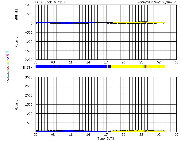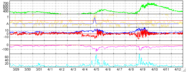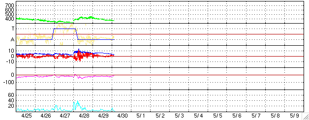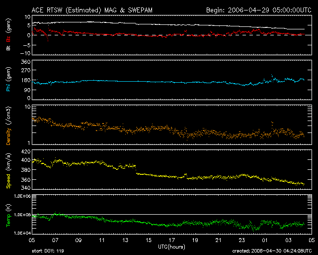 GOES衛星の太陽X線データ (c) NOAA/SEC ![]() SOHO衛星のMDIカメラによる太陽黒点 (c) SOHO (ESA & NASA) ![]() ACEが観測した太陽風の磁場(1番上の枠、白線は全体の強度、赤線は南北成分) および、太陽風の密度(3番目の橙線)、速度(4番目の黄線) (c) NOAA/SEC ![]() リアルタイムAE指数 下段のAEグラフの値が高くなると、オーロラ活動が活発化しています。 (c) 京都大学, NICT ![]() 27日の太陽周期に合わせたデータプロット (太陽風版) 太陽が同じ面を地球に向けていた27日前の変化から、今後を予想することができます。 (c) NICT