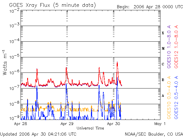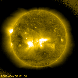 2006/ 4/30 13:27 更新 太陽の東端で小規模フレアが続いています。太陽風、磁気圏は静穏です。 担当 篠原 今朝、30日10時半(世界時30日1時半)に、 C5.4の小規模フレアが太陽の東端(左端)の領域で発生しました。 SOHO EIT284の太陽写真で明るく輝いて見えている、これから上がって来る活動領域です。 昨日のニュースでも、この領域が起こした小規模フレアについてお知らせしましたが、 その後、30日1時(世界時29日16時)にも、C2.3の小規模フレアを起こしており、 3つの小規模フレアを連続して発生させていることになります。 30日1時(世界時29日16時)の小規模フレアでは、CME(太陽ガスの放出現象)を起こしています。 地球に対して横方向に飛んでいますので、影響はありません。 この後、どのような規模で黒点群が姿を現すのか、注目されます。 一方、太陽の中心から南西(右下)に下がった領域で、フィラメント消失が発生しています。 29日20時(世界時29日11時)ころから始まっています。 SOHO衛星のEIT195カメラによる動画を掲載します。 比較のために、EIT195の太陽全体の写真も掲載しています。 中央の明るい活動領域から、右下に太陽の半径の半分ほど行ったところに見えている黒い筋です。 この現象で発生した太陽風の乱れが、4日ほど経つと地球へやってくるかもしれません。 5月3〜4日頃でしょうか。 ここしばらく、太陽をにぎわせてくれていた875、876黒点群は、減衰に向かっている様です。 領域の面積がどんどん減少しています。 ただ、依然、中規模フレアを起こす可能性は指摘されていますので、 もうしばらく注視することは必要でしょう。 太陽風は、速度が400km/秒からゆっくりと低下し、350km/秒に下がっています。 磁場強度も6nTから、3nTへ弱まり、南北成分は0nT付近にとどまっています。 このため、磁気圏はとても穏やかです。 オーロラの活動を示すAE指数のグラフには、全く変化が見えていません。 太陽風は、引き続き穏やかな状態が続きそうです。 27日周期の図では、4月4日から5日にかけて、太陽風磁場の大きな乱れが発生していますが、 この変動は周期的な現象ではないと思います。 4月5-6日に起きている小さな速度上昇に対応する変化が、5月2-3日に見られるかもしれません。 また、最初に述べた、フィラメント消失の影響がそれに続いて到来する可能性があります。 SOHO EIT195カメラによる、29日のフィラメント消失の様子(29日20時〜30日2時、世界時29日11時〜17時)。 (c) ESA & NASA ![]() SOHO衛星のEIT284カメラの映像 (c) SOHO (ESA & NASA)