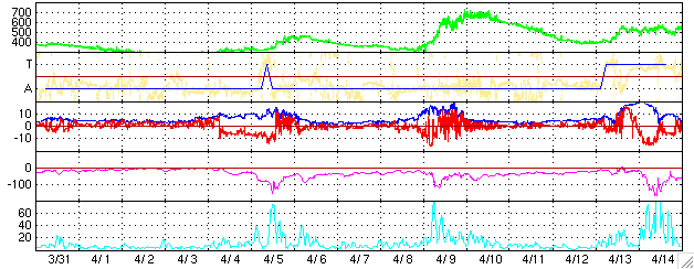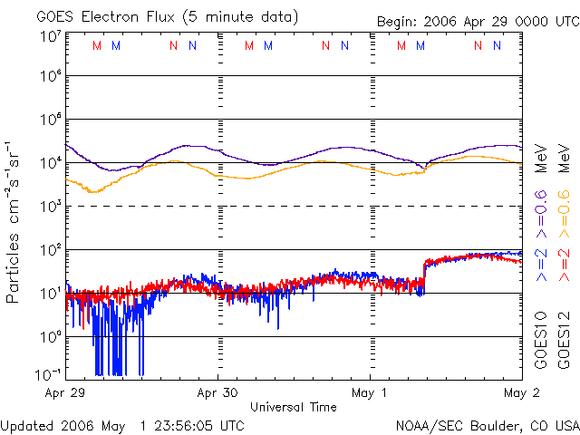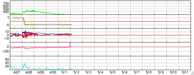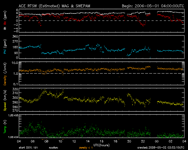 GOES衛星の太陽X線データ (c) NOAA/SEC ![]() SOHO衛星のMDIカメラによる太陽黒点 (c) SOHO (ESA & NASA) ![]() ACEが観測した太陽風の磁場(1番上の枠、白線は全体の強度、赤線は南北成分) および、太陽風の密度(3番目の橙線)、速度(4番目の黄線) (c) NOAA/SEC ![]() リアルタイムAE指数 下段のAEグラフの値が高くなると、オーロラ活動が活発化しています。 (c) 京都大学, NICT ![]() GOES衛星による、静止衛星軌道における高エネルギー電子の変化 (c) NOAA/SEC ![]() 27日の太陽周期に合わせたデータプロット (太陽風版) 太陽が同じ面を地球に向けていた27日前の変化から、今後を予想することができます。 (c) NICT