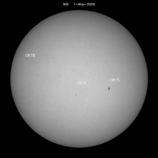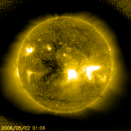 2006/ 5/ 2 12:55 更新 875黒点群でC1の小規模フレアが発生し、弱いCMEが発生しています。太陽風、磁気圏は静穏です。 担当 篠原 875黒点群が、1日23時半(世界時1日14時半)にC1の小規模フレアを起こしました。 X線のグラフがゆっくりと変化する、長時間型のフレアです。 これに関係してCME(太陽ガスの放出現象)が発生しています。 SOHO LASCO C3の連続写真を掲載します。 たいへん淡いのですが、太陽から右下に向かって白いガスが広がっているのが見えます。 小規模ですので、地球へ大きな影響を及ぼすことはないでしょう。 (ある程度の乱れは運んで来るかもしれません) 875, 876黒点群は、規模が次第に小さくなっています。 目立ったフレア活動を起こす可能性は、だいぶ小さくなっています。 太陽風は、速度は300km/秒前後で安定していて、とても穏やかです。 磁場強度は3nTとやや弱く、概ね北寄りで推移しています。 途中(1日16時、世界時1日7時頃)、 磁場の小さな乱れが発生しています(赤線と水色の線にジャンプがあります)。 この影響でAE指数にぽこっとした変化が発生しています(1日17時、世界時1日8時頃)。 GOES衛星の放射線帯観測にも変化があり、 高エネルギー電子の数値が瞬間的に増加しています(数値が小さいので影響はありません)。 小規模ですが、磁気圏が太陽風磁場に揺り動かされたという印象です。 さて、SOHO EIT284の太陽写真を見ると、 太陽の中心付近にコロナホールがしっかりと広がって見えてきました。 27日前の4月5日の写真と比較してください。 ホールの広がりが大きくなり、場所もやや右に移動して見えます。 このため、前周期よりも規模の大きな高速風が、少し早まって到来するかもしれません。 27日周期の図を見ると、前回は4月9日から高速風がやってきました。 これは、今周期では5月6日にあたります。 しかし、SOHOの写真の様子から、高速風は早ければ5日には来るのではないでしょうか。 前回の最高速は700km/秒、高速風は3日ほど続きました。 さて、今回はどのような高速風がやってくるでしょうか。 SOHO衛星のEIT284カメラの映像 (c) SOHO (ESA & NASA)