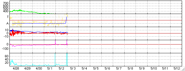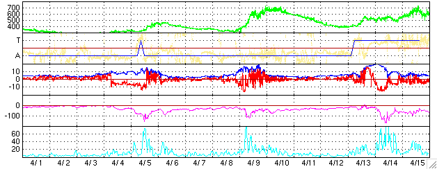 ACEが観測した太陽風の磁場(1番上の枠、白線は全体の強度、赤線は南北成分) および、太陽風の密度(3番目の橙線)、速度(4番目の黄線) (c) NOAA/SEC ![]() リアルタイムAE指数 下段のAEグラフの値が高くなると、オーロラ活動が活発化しています。 (c) 京都大学, NICT ![]() 27日の太陽周期に合わせたデータプロット (太陽風版) 太陽が同じ面を地球に向けていた27日前の変化から、今後を予想することができます。 (c) NICT
