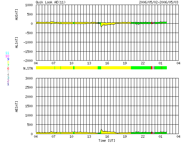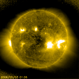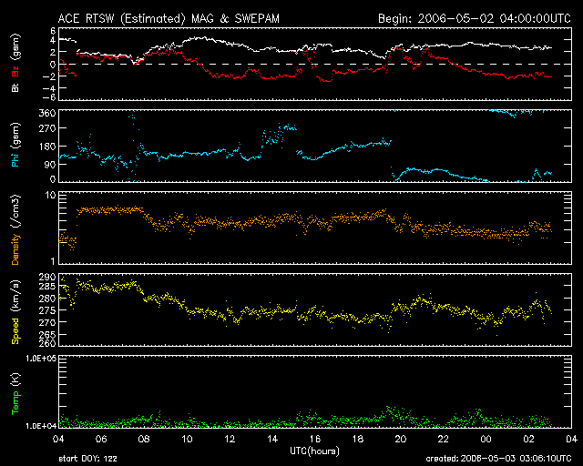 2006/ 5/ 3 12:06 更新 宇宙天気は概ね静穏です。コロナホールが太陽の中心に来ています。5日ころから高速風に注意が必要です。 担当 篠原 宇宙天気は穏やかな状態です。 太陽風は、速度が280km/秒まで下がり、かなり低速です。 磁場強度は3nT前後。 -2nTくらいの弱い南向きが頻繁に見られていますが、 強度が弱いことと、速度がたいへん遅いため、目立った磁気圏の活動には繋がっていません。 オーロラ活動を示すAE指数には、変化はほとんど見られていません。 ただ、こういう静穏な太陽風の時には、オーロラ活動が高緯度側に移動する傾向があり、 AE観測網だけではオーロラ活動の全体像を正確に測れなくなっている面があります。 オーロラ活動が現在どの緯度帯で発生しているのか、 それを知るひとつの資料としてリアルタイムオーロラ帯の図があります。 カナダの研究グループが作成しているページです。 現在の地上磁場観測データから推定した、オーロラの活動領域が表示されます。 北米だけの地域的にかたよった観測データによる推定ですが、 参考資料としてたいへん有用です。 SOHO EIT284の太陽写真の真ん中に、コロナホールが広がっています。 ちょうど今、太陽から地球へ向かって吹き出している高速の風が、 約3日ほどかけて地球へやって来ます。 既にコロナホールの先端(右端)は太陽の中心線を過ぎていますので、 高速風の始まりは、これから2日ほどでやってくるのではないでしょうか。 5日以降は太陽風の乱れに注意が必要です。 太陽風磁場の南向きが強まると、オーロラ活動が激しくなったり、磁気嵐が発生します。 特に、速度が上昇する頃に磁気圏が乱れる傾向があります。 太陽風の磁場強度の強まりに注目してください。 太陽面は、875, 876, 878, 879と4つの黒点群が見えています。 みな、規模が小さくなり、フレア活動もすっかり穏やかになりました。 X線の動画を見ていても、目立った変動は起こしていません。 穏やかな太陽になっています。 SOHO衛星のEIT284カメラの映像 (c) SOHO (ESA & NASA)