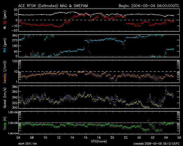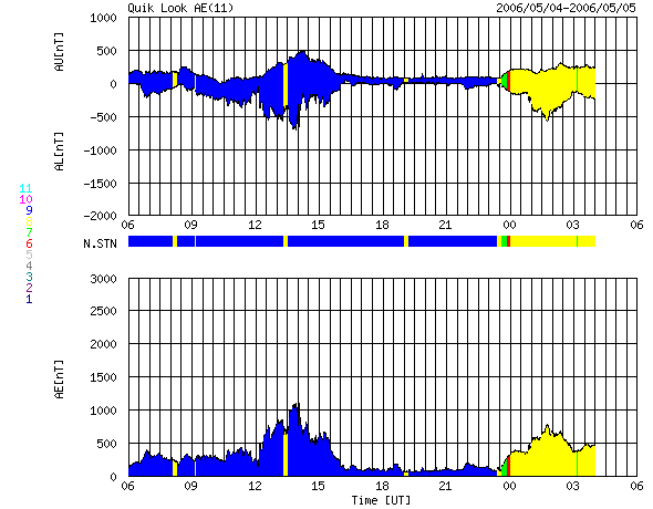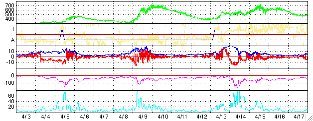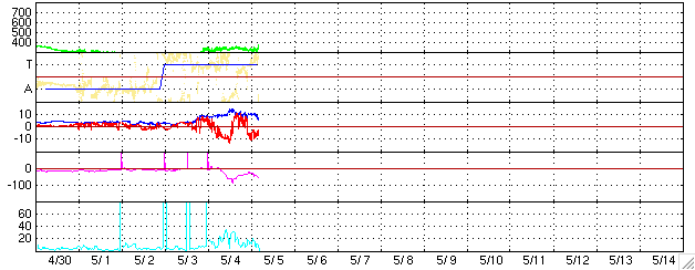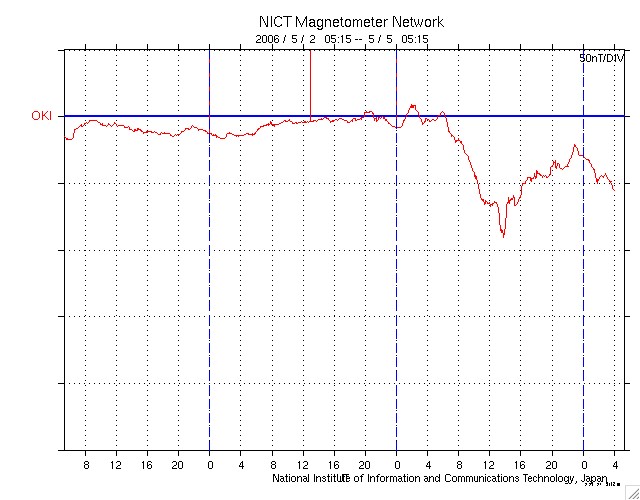 ACEが観測した太陽風の磁場(1番上の枠、白線は全体の強度、赤線は南北成分) および、太陽風の密度(3番目の橙線)、速度(4番目の黄線) (c) NOAA/SEC ![]() リアルタイムAE指数 下段のAEグラフの値が高くなると、オーロラ活動が活発化しています。 (c) 京都大学, NICT ![]() 沖縄の磁場擾乱 下へ下がるほど、擾乱が発達している事を意味します。 (c) NICT ![]() 27日の太陽周期に合わせたデータプロット (太陽風版) 太陽が同じ面を地球に向けていた27日前の変化から、今後を予想することができます。 (c) NICT