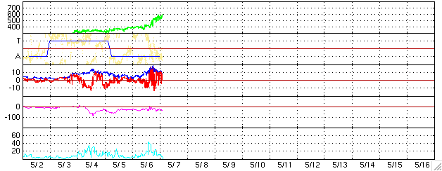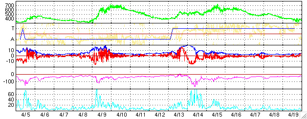 ACEが観測した太陽風の磁場(1番上の枠、白線は全体の強度、赤線は南北成分) および、太陽風の密度(3番目の橙線)、速度(4番目の黄線) (c) NOAA/SEC ![]() リアルタイムAE指数 下段のAEグラフの値が高くなると、オーロラ活動が活発化しています。 (c) 京都大学, NICT ![]() 27日の太陽周期に合わせたデータプロット (太陽風版) 太陽が同じ面を地球に向けていた27日前の変化から、今後を予想することができます。 (c) NICT