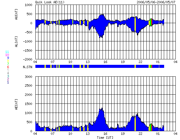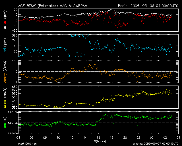 2006/ 5/ 7 12:06 更新 高速太陽風が来ました。速度が600km/秒近くに上昇しています。 担当 篠原 いよいよ高速太陽風がやって来ました。 ACE衛星の観測によると、昨日、6日16時(世界時6日7時)頃から太陽風の磁場が強まり始め、 7日2時(世界時6日17時)頃に20nT近くまでたいへん強まりました。 その後、磁場強度は下がり、現在は10nTで安定しています。 磁場強度の上昇に遅れて、7日0時(世界時6日15時)頃から、 太陽風の速度も本格的な上昇を始めました。 速度は400km/秒から、約半日かけて600km/秒近くまで上昇しています。 ACEのグラフでは、速度の線はまだ上向きのままですが、 磁場強度の強まりが一段落ついているので、 速度としてもピークを迎えつつあると思われます。 前周期は650km/秒程度まで上昇していますので、ほぼ同じ強さの高速風になっています。 太陽風磁場が強まった時に、南北成分もまた大きく南北に変動しました。 6日20時(世界時6日11時)から7日5時(世界時6日20時)にかけて、-10nTの南向き磁場が、 数時間続いたり、南北に大きく切り替わったりと、おもしろい変化を示しています。 この影響で、磁気圏の活動も活発になっています。 AE指数では1000nT程度の活動が2つの時間帯で観測されています。 これらは、ACEの太陽風磁場が大きく南を向いた時間帯に続くように発生しています。 また、京都大学のDstデータによると、小規模の磁気嵐も発生している様です。 現在、太陽風は高速(600km/秒近く)で、磁場強度も強まったまま(10nT)です。 南北成分が北寄りになっているため、磁気圏活動は落ち着いていますが、 今後南寄りに傾向が変わった場合は、再び磁気圏が活動的になるでしょう。 速度が高い間は注意が必要です。 27日周期の図を参考にすると、前回の高速風は3日ほど続きました。 太陽では、小さな黒点群が5つあります。 882群は番号が書かれていませんが、太陽の中心のやや右下にあります。 フレア活動は概ね穏やかです。 SOHO衛星のEIT284カメラの映像 (c) SOHO (ESA & NASA)