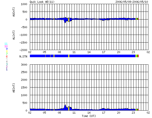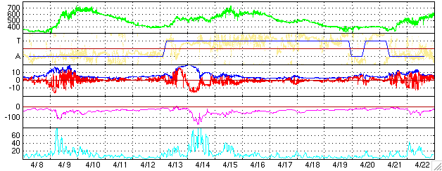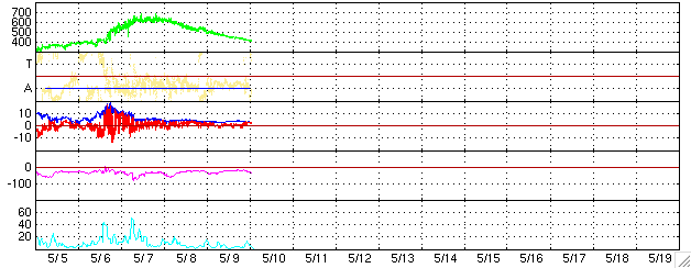 ACEが観測した太陽風の磁場(1番上の枠、白線は全体の強度、赤線は南北成分) および、太陽風の密度(3番目の橙線)、速度(4番目の黄線) (c) NOAA/SEC ![]() リアルタイムAE指数 下段のAEグラフの値が高くなると、オーロラ活動が活発化しています。 (c) 京都大学, NICT ![]() 27日の太陽周期に合わせたデータプロット (太陽風版) 太陽が同じ面を地球に向けていた27日前の変化から、今後を予想することができます。 (c) NICT