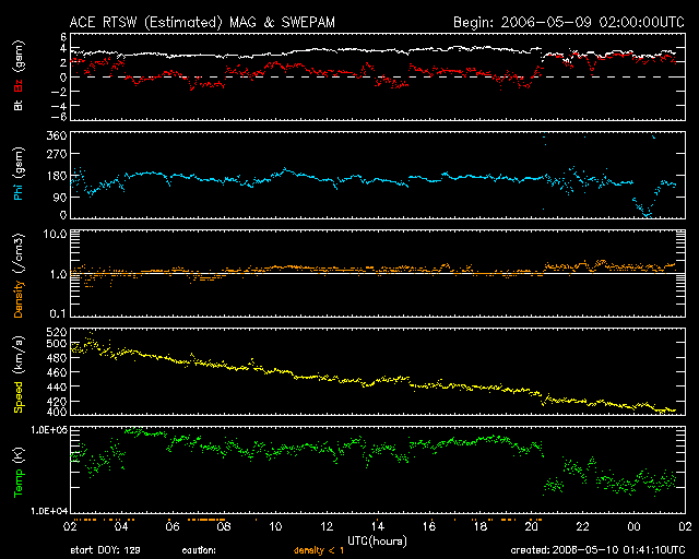 2006/ 5/10 10:45 更新 太陽風は速度が低下しています(400km/秒)。磁気圏も静穏です。 担当 篠原 太陽風は、引き続きゆっくりと速度を下げ、400km/秒と通常の速度に戻りました。 磁場強度は3nTとやや弱く、南北成分は0nT付近から、最新では北寄りになっています。 速度が下がったことと、南向き磁場がほとんど無いことから、 太陽風から磁気圏への影響はとても小さくなっており、 オーロラ活動を示すAE指数はほとんど変化が無い状態です。 SOHO EIT284の太陽写真は、昨日、9日10時(世界時9日1時)と1日古いものです。 太陽の北側(上側)の中心から左にかけてコロナホールが広がっているのが見えます (他よりも薄暗く見えている領域です。ここから高速の太陽風が吹き出しています)。 1日前の写真ですので、現在のコロナホールはこれよりも西側(右側)に進んだ場所にあります。 この位置関係では、明日の午後くらいから高速太陽風が地球へ到来しそうです。 27日周期の図では、前周期は4月13日(世界時)から太陽風の速度の上昇が始まりました。 これは今周期では今日、5月10日に相当し、今日(日本時間では今夜)あたりから高速風が来ると予想されます。 その一方、4月13-14日に見えている太陽風磁場(青線と赤線)の大きな変化は、 コロナホールとは違う、突発性の現象と関係しているとのことです。 その場合は、周期性はありませんので、高速風の到来は明日以降になるでしょう。 放射線帯の高エネルギー電子は、警戒ラインに達する前に増加は止まっています。 太陽のフレア活動は穏やかです。 882黒点群は、黒点の大きさが昨日の写真よりもやや大きくなっている様に見えますが、 フレア活動はほとんど起こしておらず、目立った活動を始めることはなさそうです。 この後、ゆっくりと西の端に沈んで行きますので、 地球へ影響を及ぼす可能性そのものが小さくなって行きます。 SOHO衛星のEIT284カメラの映像 (c) SOHO (ESA & NASA)