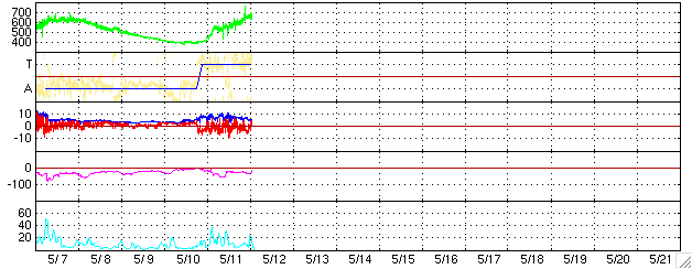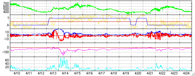 ACEが観測した太陽風の磁場(1番上の枠、白線は全体の強度、赤線は南北成分) および、太陽風の密度(3番目の橙線)、速度(4番目の黄線) (c) NOAA/SEC ![]() リアルタイムAE指数 下段のAEグラフの値が高くなると、オーロラ活動が活発化しています。 (c) 京都大学, NICT ![]() 27日の太陽周期に合わせたデータプロット (太陽風版) 太陽が同じ面を地球に向けていた27日前の変化から、今後を予想することができます。 (c) NICT