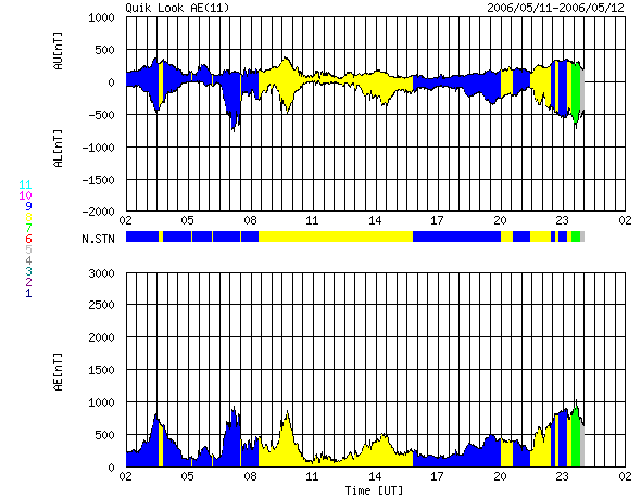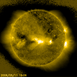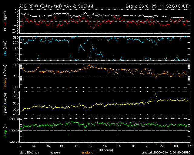 2006/ 5/12 10:50 更新 太陽風は高速になっています(650km/秒)。オーロラ活動が活発に続いています。 担当 篠原 昨日のニュース以降、太陽風は速度を上げ続け、12日6時(世界時11日21時)に650km/秒に達しました。 その後、まだ4時間ほどですが、ほぼこの速度で安定しています。 太陽風の磁場強度は10nT弱にまで強まっていましたが、 速度が上昇を続けるにつれて、こちらはゆっくりと弱まり、現在は5nTに下がっています。 これらのことから、今回の高速風は最高速に達したと思われます。 27日周期の図を見ると、速度の最高値は前周期とほぼ同じ値になっています。 時間としては、半日ほど変化が早まった様です。 太陽風磁場の南北成分は、+5〜-5nTの幅で、南北にゆらゆらと揺れるように変化をしています。 このため、オーロラ活動が活発になっています。 AE指数では、1000nT前後の変動が度々発生しています。 現在も太陽風が高速ですので、オーロラ活動が活発になりやすい状況が続いています。 ただ、太陽風磁場が弱まって来ていますので、大きな南向きが発生して、 大きな磁気圏活動が発生するという可能性は弱まっています。 速度とともに南向き磁場も大きくなければ、激しい磁気圏活動は発生しません。 27日周期で前周期の変化を見ると、高速風は最高速に達した後、2日ほどで下がっています。 SOHO EIT284の太陽写真でも、コロナホールは既に太陽の中心線を過ぎていますので、 今回も、2〜3日ほどで下がって行くでしょう。 一方、太陽の赤道の東側(左側)に、別のコロナホールが見えています。 5日ほど後に、今度はこちらの影響が地球に及びそうです。 放射線帯の高エネルギー電子の密度が増加の気配を見せています。 まだ、高いレベルではありませんが、これから更に増加を続けると思われますので、 今後の変化に注目して下さい。 太陽では、新しく中心付近に883黒点群ができています。 今日掲載している写真ではまだ見つけることはできません。 ここが、ついさきほど、12日8時(世界時11日23時)にB4程度の小さなフレアを起こしています。 とても小さなフレアなのですが、GOES衛星のX線動画を見ると、 小規模のCME(太陽ガスの放出現象)を起こしているかもしれません。 明日になればSOHOの写真で状況が分かるでしょう。 黒点群はどれも小規模で、太陽のフレア活動は穏やかな状態が続くと思われます。 SOHO衛星のEIT284カメラの映像 (c) SOHO (ESA & NASA)