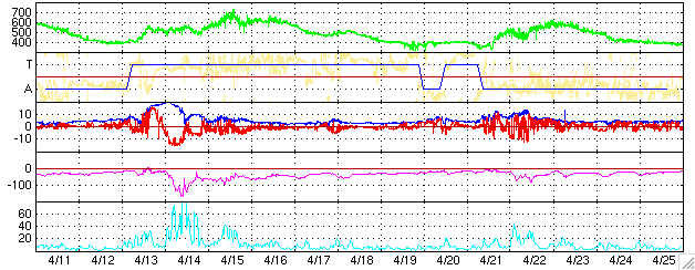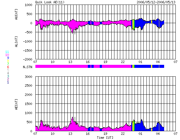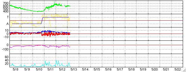 ACEが観測した太陽風の磁場(1番上の枠、白線は全体の強度、赤線は南北成分) および、太陽風の密度(3番目の橙線)、速度(4番目の黄線) (c) NOAA/SEC ![]() リアルタイムAE指数 下段のAEグラフの値が高くなると、オーロラ活動が活発化しています。 (c) 京都大学, NICT ![]() 27日の太陽周期に合わせたデータプロット (太陽風版) 太陽が同じ面を地球に向けていた27日前の変化から、今後を予想することができます。 (c) NICT