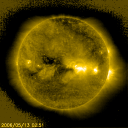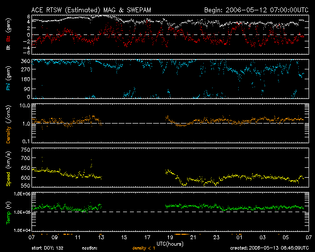 2006/ 5/13 15:47 更新 太陽風の速度は570km/秒へ下がっています。地球は、高速風領域を抜けつつあります。 担当 篠原 更新が遅くなり、申し訳ありません。 今日より木曜日まで、学会出席のため更新時間が不規則になります。 ご了解ください。 高速太陽風はピークを過ぎて、速度はゆっくりと低下に向かっています。 昨日の650km/秒から低下が続き、570km/秒まで下がりました。 磁場強度は約4nT。 南北成分は-2nT程度の弱い南向きを保ちつつ、振動しています。 小振幅の南向きが続いているため、磁気圏活動も小規模のものが連続的に発生しています。 AE指数を見ると、500nT前後の活動が時々発生するとともに、200nTの小さな活動が連続しています。 速度は下がっていますが、太陽風はまだ高速という状態です。 まだしばらくは、小規模の磁気圏活動が続きそうです。 速度が下がるとともに、磁気圏へ流れ込むエネルギーは小さくなり、磁気圏は静穏になります。 SOHO EIT284の太陽写真(左が最新です)には、中心に黒くコロナホールが見えています。 ほぼ赤道にあり、横に長く延びていますので、まとまった高速風を地球にもたらすかもしれません。 今日の写真(左)と、27日前の5月13日の写真(右)を比較してください。 左の写真と違い、右の写真ではコロナホールはやや北寄り(上寄り)で、面積も小さな状態です。 従って、今後の太陽風の変化は、27日前のものとは違ってくるでしょう。 コロナホールの先端(右端)が太陽の中心を過ぎていますので、 3日後の5月16日くらいから高速風はやってきそうです。 一方、昨日のニュースで、12日8時(世界時11日23時)のB4程度の小さなフレアで、 CME(太陽ガスの放出現象)が発生しているのではないかと書きましたが、 SOHO LSACO C3を見ると、とても淡いガスが飛び出しているように見えます。 (東向き(左向き)にもガスの飛び出しが見えていますが、これは別のCMEだと思われます) ガスがかなり淡いので、大きな影響はないでしょう。 時間的に考えると、コロナホールの高速風と重なるようにやって来るかもしれません。 放射線帯の高エネルギー電子の密度が急増しています。 一気に、警戒ラインの10の4乗に増加しました。 更に上昇するかもしれませんので、今後の変化に注意が必要です。 太陽のフレア活動は穏やかです。 黒点群は3つあるそうですが、今日の写真で見えるのは880群の1個だけです。 今後も、穏やかな状態が続くでしょう。 SOHO衛星のEIT284カメラの映像 (c) SOHO (ESA & NASA)