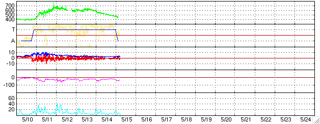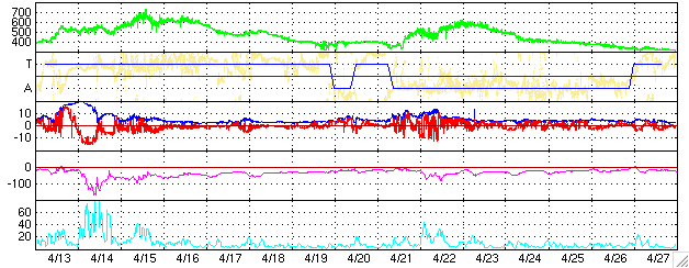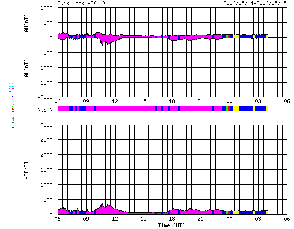 ACEが観測した太陽風の磁場(1番上の枠、白線は全体の強度、赤線は南北成分) および、太陽風の密度(3番目の橙線)、速度(4番目の黄線) (c) NOAA/SEC ![]() リアルタイムAE指数 下段のAEグラフの値が高くなると、オーロラ活動が活発化しています。 (c) 京都大学, NICT ![]() 27日の太陽周期に合わせたデータプロット (太陽風版) 太陽が同じ面を地球に向けていた27日前の変化から、今後を予想することができます。 (c) NICT