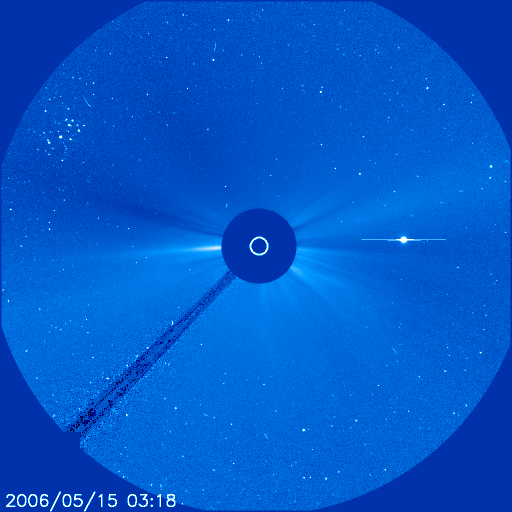 2006/ 5/15 14:49 更新 太陽風の速度は下がり、通常のレベルに戻っています。放射線帯高エネルギー電子は高い状態が続いています。 担当 篠原 宇宙天気の春の風物詩、おうし座のプレアデス星団(すばる)がSOHO衛星の視野に入ってきました。 今日の1枚目の写真に掲載しています。 左上隅に見えている、星の集団です。 地球の公転のために、太陽の背景に見える星はSOHOの視野を右方向へ進んでいきます。 これからしばらくの間、すばるの姿をSOHOで眺めることができます。 太陽風はゆっくりと速度を下げ続けています。 550km/秒から1日かけて440km/秒に下がりました。 ほぼ通常の速度に戻ったと言えるでしょう。 磁場強度は3nTとやや弱いレベルが続いています。 速度が下がった事と磁場強度が弱まっているため、磁気圏は概ね静穏です。 AE指数には目立った変化は見られません。 ここしばらくお知らせしていましたが、 明日くらいからコロナホールによる高速風がやってくると予想されます。 SOHO EIT284の太陽写真をご覧下さい(左が今日、右は27日前です)。 太陽の中心から西(右)に暗い領域(コロナホール)が見えています。 このコロナホールは、太陽の中心から西端へ半分ほど行き過ぎたところに達しています。 ここは地球へ高速風の影響が及び始める目安の位置です。 これから明日にかけて太陽風の磁場が高まる変化が始まり、やがて速度の上昇が見られるでしょう。 また、太陽の中心から東(左)には、別のコロナホールが姿を現しています。 4日後くらいからはこちらの影響がやってきそうです。 右の27日前の太陽写真と比較して欲しいのですが、 コロナホールの分布が前周期と今周期とではずいぶんと変わってしまっています。 従って、これからの太陽風の変化も、27日前のものとはだいぶ様子が変わると思います。 放射線帯の高エネルギー電子は、密度の高い状態が続いています。 昨日よりは若干下がりましたが、GOES10、12ともに10の4乗を越えています。 衛星の運用では、引き続き注意が必要でしょう。 太陽は静穏です。 黒点はほとんど見えず、X線のレベルはかなり下がっています。 SOHO衛星LASCO C3カメラに、プレアデス星団(すばる)が見えてきました(左上隅)。 (c) ESA & NASA ![]() SOHO衛星のEIT284カメラの映像 (c) SOHO (ESA & NASA)