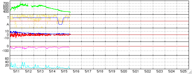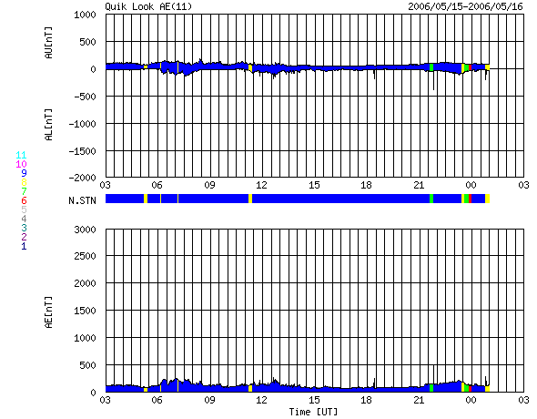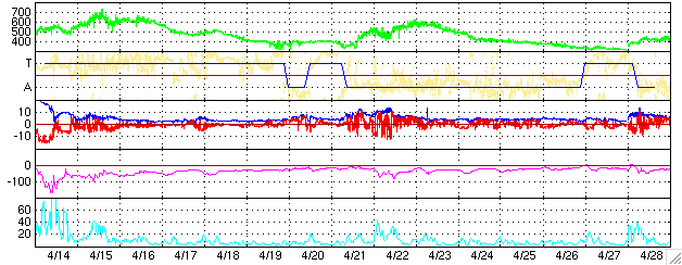 ACEが観測した太陽風の磁場(1番上の枠、白線は全体の強度、赤線は南北成分) および、太陽風の密度(3番目の橙線)、速度(4番目の黄線) (c) NOAA/SEC ![]() リアルタイムAE指数 下段のAEグラフの値が高くなると、オーロラ活動が活発化しています。 (c) 京都大学, NICT ![]() 27日の太陽周期に合わせたデータプロット (太陽風版) 太陽が同じ面を地球に向けていた27日前の変化から、今後を予想することができます。 (c) NICT
