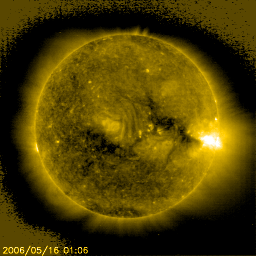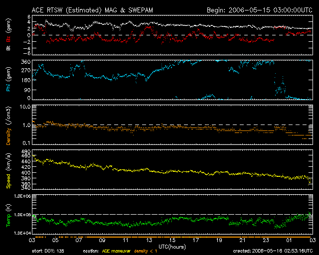 2006/ 5/16 11:53 更新 穏やかな太陽風が続いています。これからコロナホールによる高速風がやってきます。 担当 篠原 太陽風は穏やかな状態で安定しています。 速度は440km/秒から380km/秒へゆっくり低下し、磁場強度は2nTへ弱まっています。 これから、コロナホールによる高速風が到来すると予想しているのですが、 太陽風のデータには、まだその気配は見えていません。 太陽風磁場の南北成分は-1〜-2nTと弱く南を向いていますが、 AE指数ではオーロラ活動はほとんど捉えられていません。 ただし、現在のように穏やかな太陽風の時は、 オーロラの活動域が普段よりも高緯度側に移動してしまい、 AE指数を決定している観測網からは正確な観測ができていないこともあります。 (その場合でも、オーロラ活動は小規模に留まっています) SOHO EIT284の太陽写真には、2つのコロナホールが赤道沿いに並んで見えています。 このうちの先行している右側のコロナホールが、地球への影響域に達しています。 ここから吹き出した高速風が、そろそろ地球へやって来ると思われます。 遅れている左側のコロナホールからは、これから3日後くらいに影響が見られるでしょう。 先行する高速風と一体化して、長い時間乱れが続くかもしれません。 これから磁場強度が強まり、続いて速度が上昇するでしょう。 南向き磁場が強まると、オーロラ活動を活発にしたり、磁気嵐が発生する可能性があります。 コロナホールの様子が前周期とかなり変わっており、 周期性を利用した太陽風の予想は使えないと思われます。 今後の太陽風の変化に注目してください。 放射線帯の高エネルギー電子は、依然高いレベルを保っています。 GOESの両衛星で10の4乗を越えています。 衛星の運用では注意が必要な状況が続いています。 ただ、これから高速風がやってきて、磁気圏に乱れをもたらすと、 高エネルギー電子は一気に減少するでしょう。 太陽はとても穏やかです。 黒点は見えなくなってしまった様です。 太陽写真は、真っ白になっています。 SOHO衛星のEIT284カメラの映像 (c) SOHO (ESA & NASA)