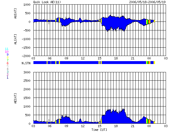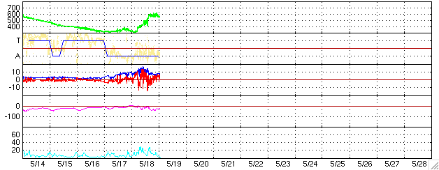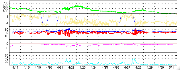 ACEが観測した太陽風の磁場(1番上の枠、白線は全体の強度、赤線は南北成分) および、太陽風の密度(3番目の橙線)、速度(4番目の黄線) (c) NOAA/SEC ![]() リアルタイムAE指数 下段のAEグラフの値が高くなると、オーロラ活動が活発化しています。 (c) 京都大学, NICT ![]() 27日の太陽周期に合わせたデータプロット (太陽風版) 太陽が同じ面を地球に向けていた27日前の変化から、今後を予想することができます。 (c) NICT