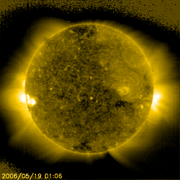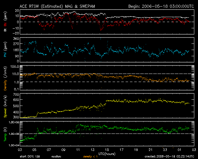 2006/ 5/19 11:23 更新 太陽風が高速になり(最高580km/秒)、磁気圏も活動的になっています。 担当 篠原 昨日のニュース以降、太陽風は速度を上げ続け、 19日0時(世界時18日15時)頃に580km/秒と高速状態に達しました。 その後はほぼ安定した状態が続いていますが、 細かく見るとゆっくりと下げているようで、現在は550km/秒になっています。 太陽風磁場の強度は12nTから8nTに下がっており、速度は既に最高速に達したと思われます。 27日周期の図を見ると、1日程度早まっていますが、 結果的には前回とほぼ同様の変化が見られています。 これからゆっくりと速度が下がって行き、 1〜2日程度かけて太陽風は穏やかな状態へ戻って行くでしょう。 太陽風磁場の南北成分は、どちらかというと北寄りに推移しているように見えます。 ところどころで、数時間幅の強い南向きが現れています。 この時に、磁気圏ではオーロラ活動が活発になっています。 AE指数で500〜800nT規模の変化が観測されています。 速度の高い状態が続いているので、今後も南向きが発生すると、オーロラ活動が活発になるでしょう。 ただ、磁場強度が弱まりつつあるので、大きな乱れは次第に発生しにくくなっています。 放射線帯の高エネルギー電子は、磁気圏活動の影響で大きく減少しています。 しかし、今回の高速風の影響で、明日以降に再び増加が始まると思われますので、注目してください。 太陽は無黒点の状態が続いています。 フレア活動も無く、穏やかです。 SOHO EIT284の写真では、太陽の東端(左端)に小さな明るい活動的な領域が見えています。 白色光の写真でも、白班(白いしみのようなもの)が見えている様です。 今後、ここに黒点が発生するかもしれません。 SOHO衛星のEIT284カメラの映像 (c) SOHO (ESA & NASA)
