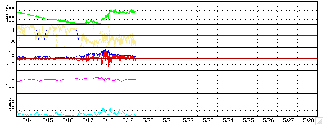 ACEが観測した太陽風の磁場(1番上の枠、白線は全体の強度、赤線は南北成分) および、太陽風の密度(3番目の橙線)、速度(4番目の黄線) (c) NOAA/SEC ![]() リアルタイムAE指数 下段のAEグラフの値が高くなると、オーロラ活動が活発化しています。 (c) 京都大学, NICT ![]() 27日の太陽周期に合わせたデータプロット (太陽風版) 太陽が同じ面を地球に向けていた27日前の変化から、今後を予想することができます。 (c) NICT