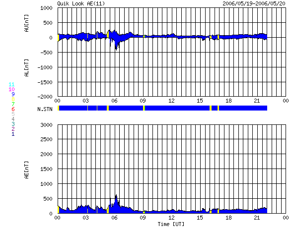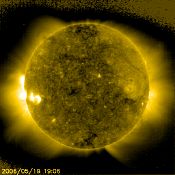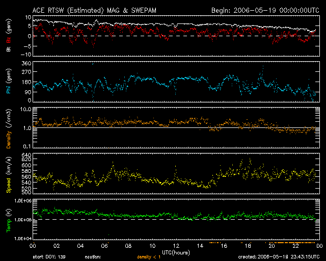 2006/ 5/20 08:45 更新 高速風は続いています(550km/秒)。磁気圏は静穏です。 担当 篠原 太陽風の速度(ACEの図の黄色線)は、550km/秒と高速の状態で安定しています。 磁場強度(白線)は徐々に弱まっていて、8nTから3nTへゆっくりと下がっています。 3nTはやや弱めと言ってよく、磁場強度がすっかり下がりましたので、 地球は高速風帯の後半部分に入っていると考えられます。 強度が弱まったので、南北成分(赤線)の振幅も次第に小さくなっています。 全体としては北寄り(プラス方向)が続いていて、図の最初と最後で南を向いています(マイナス方向)。 このため、オーロラ活動もAE指数の図の最初のあたりに500nT程度の小規模のものが見えているだけです。 最後の部分にも小さな変化が見られそうですが、プロットされるのはこれからです。 磁場強度が弱まってきていますので、今後は南を向いても小規模の変化しか現れないでしょう。 速度も低下の方向にありますので、磁気圏はより穏やかな状態へ移行します。 SOHO EIT284の太陽写真は全体的にのっぺりとしていて、変化がなく、 コロナホールは見られません。 当分の間、穏やかな太陽風が続きそうです。 放射線帯の高エネルギー電子は、低いレベルが続いています。 高速風の後は、密度が増加することがよく見られます。 今日から明日にかけて、様子を見る必要があるでしょう。 (今回は、あまり増加しないような感じがします) 太陽は穏やかな状態が続いています。 写真では見ることができませんが、884番という新しい黒点群が出現したそうです。 恐らく、SOHO EIT284の写真で、太陽の南東(左下)に明るく見えている領域に現れたのでしょう。 SOHO衛星のEIT284カメラの映像 (c) SOHO (ESA & NASA)