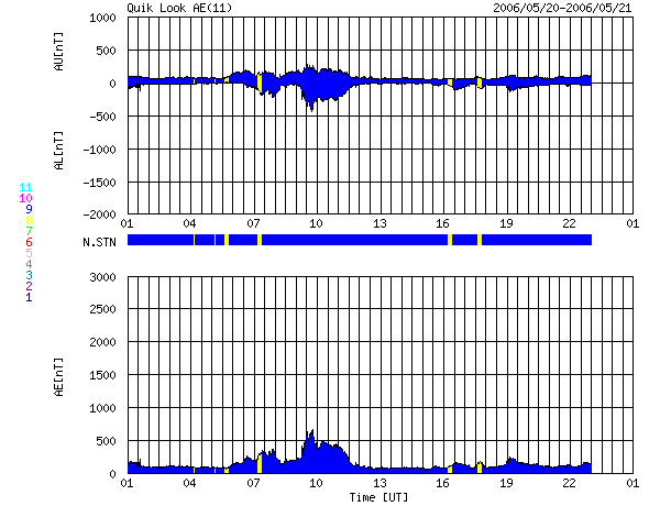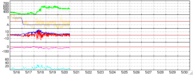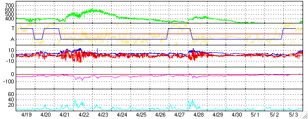 ACEが観測した太陽風の磁場(1番上の枠、白線は全体の強度、赤線は南北成分) および、太陽風の密度(3番目の橙線)、速度(4番目の黄線) (c) NOAA/SEC ![]() リアルタイムAE指数 下段のAEグラフの値が高くなると、オーロラ活動が活発化しています。 (c) 京都大学, NICT ![]() 27日の太陽周期に合わせたデータプロット (太陽風版) 太陽が同じ面を地球に向けていた27日前の変化から、今後を予想することができます。 (c) NICT