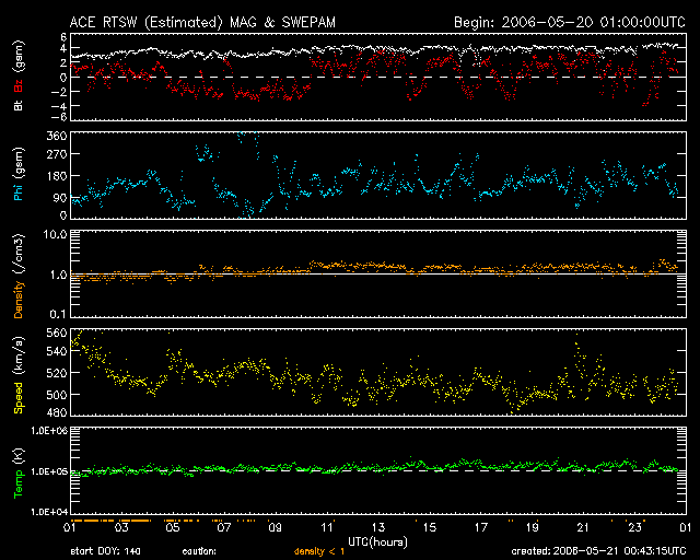2006/ 5/21 09:42 更新 太陽風はやや速度を下げましたが、高速状態が続いています(500km/秒)。 担当 篠原 太陽風は高速状態が続いています。 昨日の550km/秒から500km/秒へ少し下がりましたが、ほぼ安定した状態です。 磁場強度は約4nTと普通の強さです。 -2nT程度の弱い南向きがしばらく続いた時間帯があり、 そこで500nTのオーロラ活動が発生しています。 その他の時間帯でも、南北成分がふらふら揺れていることから、 かなり小さなオーロラ活動は見られているかもしれません(AE指数も微妙に変化しています)。 SOHO EIT284の太陽写真にはコロナホールは見られません。 また、27日周期の図を見ると、前周期は4月24日で速度は下がっています。 これは今周期では今日、5月21日に相当します。 これらのことから、太陽風は次第に低下していくと思われます。 放射線帯の高エネルギー電子は、それほどの変化を示していません。 今回は大きく増加する事はないのではないでしょうか。 太陽写真には、昨日お知らせした884黒点群の姿が見えています。 その左にも別の黒点群が出現している様です。 いずれも小規模で、フレア活動も穏やかです。 太陽は静穏な状態が続くでしょう。 SOHO衛星のEIT284カメラの映像 (c) SOHO (ESA & NASA)