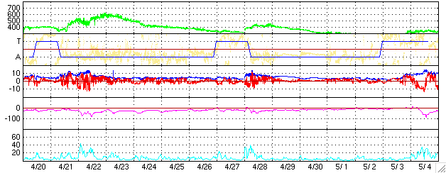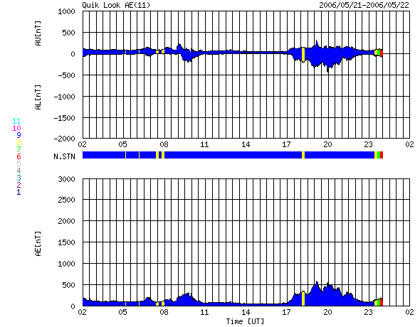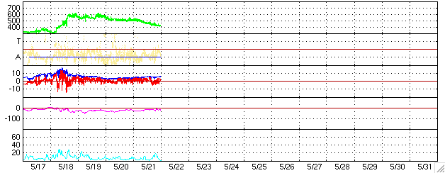 ACEが観測した太陽風の磁場(1番上の枠、白線は全体の強度、赤線は南北成分) および、太陽風の密度(3番目の橙線)、速度(4番目の黄線) (c) NOAA/SEC ![]() リアルタイムAE指数 下段のAEグラフの値が高くなると、オーロラ活動が活発化しています。 (c) 京都大学, NICT ![]() 27日の太陽周期に合わせたデータプロット (太陽風版) 太陽が同じ面を地球に向けていた27日前の変化から、今後を予想することができます。 (c) NICT