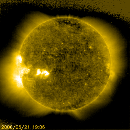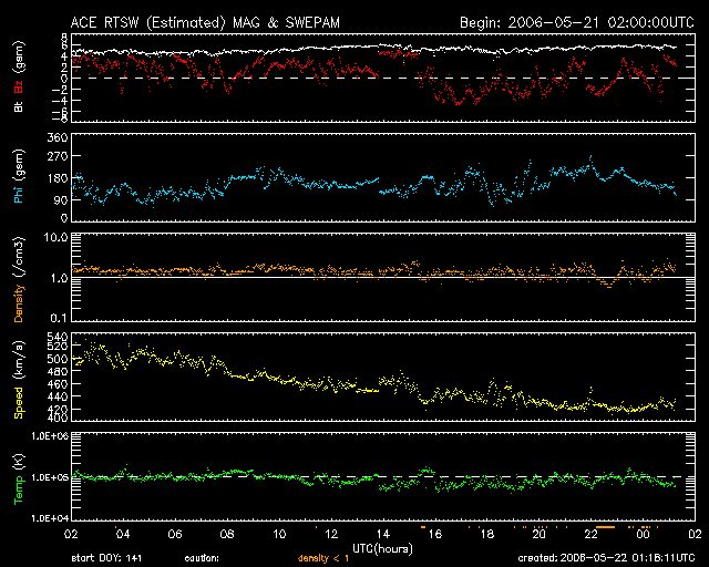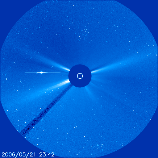 2006/ 5/22 10:20 更新 太陽風は速度が静穏レベルに戻っています(400km/秒)。プレアデス星団がSOHOの視野を通過中です。 担当 篠原 先週の15日に、SOHO衛星のLASCO C3カメラの視野に入ってきたプレアデス星団(すばる)を紹介しましたが、 1週間経って、ほぼ視野の中央に達しました。 宇宙から見るすばるの姿も、あと1週間程度です(来年の5月にまた見えます)。 どうぞ、SOHOのページへ行き、動画でもすばるの様子をごらん下さい。 また、太陽の左に見えている明るい星は、外合を過ぎた水星です。 動画では、まるで宇宙船が飛んでいるかの様な見え方です。 昨日より1日かけて、太陽風は速度が500km/秒から400km/秒へ下がりました。 これは、通常の速度レベルです。 地球は高速風領域を抜け出しています。 磁場強度は5nTと通常の強さで安定しています。 南北成分を見ると、ACEの図の後半で-3nT程度の南向きが続いています。 この影響で磁気圏がやや活発になっています。 既に速度が下がっていますので、大きな活動にはならず、 AE指数で500nT程度の比較的小規模の活動です。 この後、太陽風は更に速度を下げて行くと思われます。 そうなると、磁気圏の活動度は更に低下します。 放射線帯の高エネルギー電子の密度は、上昇も止まって、低いレベルで安定しています。 この後、増加することはないでしょう。 太陽は、885黒点群が新しく番号付けされています。 854群とともに、どちらも規模は小さく、太陽は穏やかな状態で推移するでしょう。 SOHO衛星LASCO C3カメラの視野を、プレアデス星団(すばる)が横切っています。水星も見えています。 (c) ESA & NASA ![]() SOHO衛星のEIT284カメラの映像 (c) SOHO (ESA & NASA)