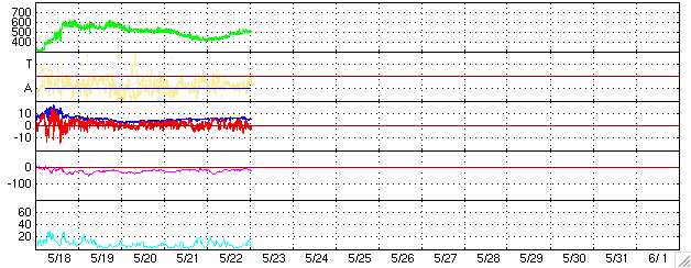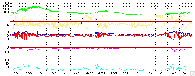 ACEが観測した太陽風の磁場(1番上の枠、白線は全体の強度、赤線は南北成分) および、太陽風の密度(3番目の橙線)、速度(4番目の黄線) (c) NOAA/SEC ![]() リアルタイムAE指数 下段のAEグラフの値が高くなると、オーロラ活動が活発化しています。 (c) 京都大学, NICT ![]() 27日の太陽周期に合わせたデータプロット (太陽風版) 太陽が同じ面を地球に向けていた27日前の変化から、今後を予想することができます。 (c) NICT