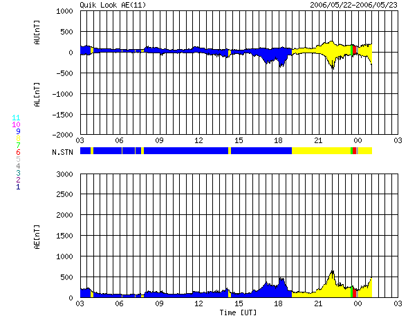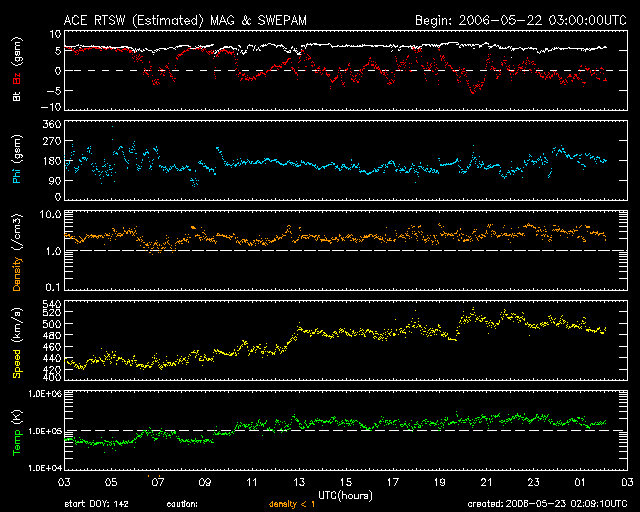 2006/ 5/23 11:10 更新 太陽風の速度がやや上昇し(500km/秒)、小規模のオーロラ活動が発生しています。 担当 篠原 400km/秒と静穏レベルに戻っていた太陽風ですが、 昨日のニュース以降ゆっくりと速度が上がり、現在500km/秒とやや高速の状態になっています。 SOHO EIT284の太陽写真では、特にコロナホールが見えるということもなく、 どういう原因でこの速度の上昇が起こっているのかはよく分かりません。 27日周期の図を見ると、前周期の4月28日に小幅の速度上昇(450km/秒程度)が見られていますが、 これと対応させるにしても、変動が3日も早まっているので現時点ではなんとも言えません。 今月の25日以降にどの様な変化が見られるかによるでしょう。 今後の予想ですが、 コロナホールなどの大規模な発生源が見られないことや、 現在の太陽風磁場の変化の様子などから考えて、大きく上昇が続くということはないでしょう。 現在のレベルがしばらく続いて、やがて穏やかになるのではないでしょうか。 速度が上がったことで、小規模のオーロラ活動が続けて発生しています。 AE指数で、500nT程度の活動が3回記録されています。 しばらくこのような状態が続くかもしれません。 太陽では、884黒点群がCクラス以下のとても小さな規模のフレアを起こしています。 X線のグラフでは、周りが低レベルなのでフレアが大きく見えますが、 B6クラスという、Cクラス(小規模フレア)の一桁下のX線強度です。 特に黒点群の規模が大きくなったということはなく、基本的には穏やかな状態が続くでしょう。 SOHO衛星のEIT284カメラの映像 (c) SOHO (ESA & NASA)