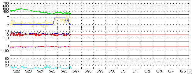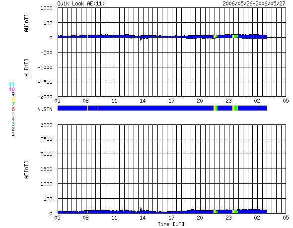 ACEが観測した太陽風の磁場(1番上の枠、白線は全体の強度、赤線は南北成分) および、太陽風の密度(3番目の橙線)、速度(4番目の黄線) (c) NOAA/SEC ![]() リアルタイムAE指数 下段のAEグラフの値が高くなると、オーロラ活動が活発化しています。 (c) 京都大学, NICT ![]() 27日の太陽周期に合わせたデータプロット (太陽風版) 太陽が同じ面を地球に向けていた27日前の変化から、今後を予想することができます。 (c) NICT