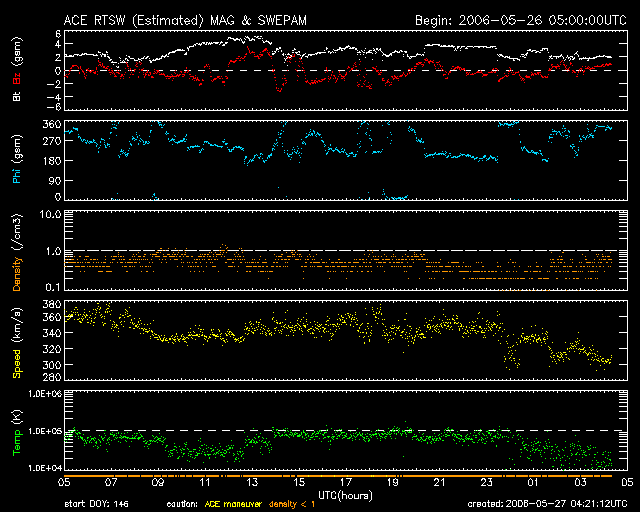 2006/ 5/27 13:23 更新 弱いhalo CMEが発生しています。明後日頃に影響が見られそうです。現在はすべて静穏です。 担当 篠原 昨日、SOHO LASCO C2の写真で、 弱いCME(太陽ガスの放出現象)が太陽の西側(右側)に飛び出している事をお知らせしましたが、 その後撮影されたLASCO C3(より広い視野を撮影する)の写真では、 太陽の東側(左側)にもガスが飛び出している様子が写っていました。 連続写真として4枚掲載していますが、ガスがものすごく淡いため、かなり見づらいです。 太陽を囲むように飛び出すCME(今回の写真では、主に左右方向ですが)は、 halo CMEと呼びます。 これは、ガスが地球方向、もしくは地球と反対方向に飛び出している時に見られます。 今回は、他の太陽の写真で発生原因と見られる現象が確認されていますので、 地球方向にガスが飛び出しています。 規模が大きくはありませんので、弱いものだと思いますが、 明日の夜から明後日くらいに到来して、太陽風に乱れを発生させる可能性があります。 速度はそれほど高まらないと思われますが、 磁場が強まって大きく南を向くと、オーロラなどの磁気圏活動が活発になりますので、 注意が必要です。 現在の太陽風は速度が320km/秒と一段と下がり、低速です。 磁場強度は2nTと弱く、南北成分は南を向いたり北を向いたりしていますが、 振幅はとても小さく、速度も遅いため、磁気圏への影響はほとんど見られません。 AE指数は全く変化が見られません。 SOHO EIT284の写真には、太陽の中心北寄りに小規模のコロナホールが見えています。 規模が小さい事と、やや緯度が高めなので、地球へはあまり影響を及ぼさないかもしれません。 影響があるとすると、明後日あたりと見られます。 CMEの変化と混ざった太陽風になるかもしれません。 太陽のフレア活動は穏やかです。 黒点群は写真では2つしか書かれていませんが、887、888黒点群が現れているそうです。 ただ、どれも規模は小さく、活動は見られません。 SOHO衛星のEIT284カメラの映像 (c) SOHO (ESA & NASA)