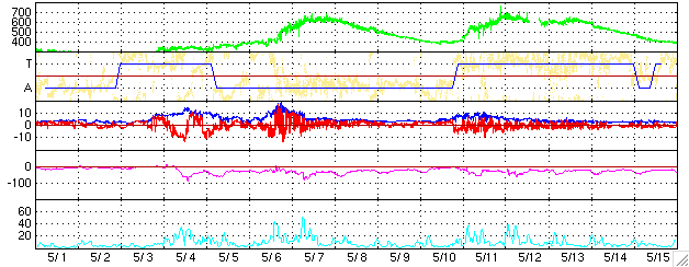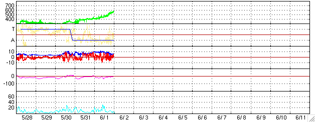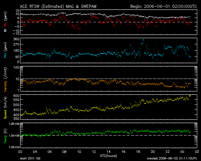 2006/ 6/ 2 10:13 更新 太陽風の速度が上昇しています(550km/秒)。磁気圏は大きくは乱れていません。 担当 篠原 昨日のニュースの後、太陽風はゆっくりと速度を上げ続けています。 それまでの400km/秒から、1日かけて現在550km/秒まで上昇しました。 この数値ではそれほどの高速風ではありません。 一方、太陽風の磁場強度は、昨日は10nTに強まっていましたが、 日付が今日に変わった頃から弱まり始め、現在は5nTに下がっています。 このことから考えると、太陽風の速度の上昇はこのあたりで止まってしまいそうです。 前周期は650km/秒まで上がっていたのに対し、 今回は高速風の規模がいくらか小さくなっている可能性があります。 もうしばらく様子を見る必要がありますが、 速度の変化は、このまま頭打ちになるかもしれません。 AE指数のデータが止まっていますが、 その他の情報から、磁気圏はある程度活動的になっている様です。 ただ、磁場が大きく南を向くことはありませんでしたので、 中規模のオーロラ活動が現れている程度でしょう。 現在は速度が上がっていますので、 南向き磁場に影響されて、オーロラ活動が強まりやすい状況になっています。 ただ、磁場強度は下がっていますので、 大きく南を向いて大規模に乱れるということはないでしょう。 高速風領域は、2〜3日の規模だと予想されます。 今日いっぱい高い状態が続いて、明日には低下が始まるのではないでしょうか。 一方、GOES衛星のX線写真では、東端(左端)に次のコロナホールらしき影が見えています。 次は、このコロナホールに注目です。 影響は5日くらい先のことになるでしょう。 太陽のフレア活動はとても穏やかです。 掲載している太陽写真では、黒点は見つけられなくなっています。 このまま穏やかな状態が続くでしょう。 GOES衛星のX線カメラで撮影した太陽の様子。コロナホールを見るために強調処理をしている。2日09時 (世界時2日00時)。 (c) NOAA/SEC ![]() ACEが観測した太陽風の磁場(1番上の枠、白線は全体の強度、赤線は南北成分) および、太陽風の密度(3番目の橙線)、速度(4番目の黄線) (c) NOAA/SEC ![]() リアルタイムAE指数 下段のAEグラフの値が高くなると、オーロラ活動が活発化しています。 (c) 京都大学, NICT ![]() 27日の太陽周期に合わせたデータプロット (太陽風版) 太陽が同じ面を地球に向けていた27日前の変化から、今後を予想することができます。 (c) NICT