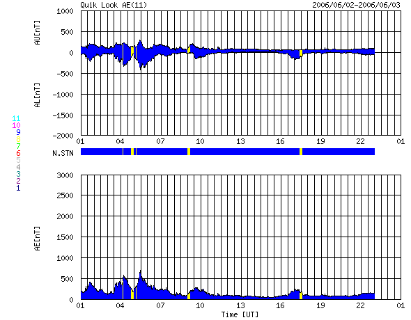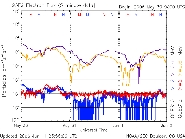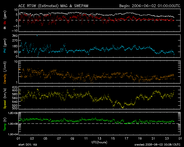 2006/ 6/ 3 09:06 更新 高速の太陽風が続いています(560km/秒)。速度はこれから低下に向かうでしょう。 担当 篠原 高速の太陽風が続いています。 ACE衛星の観測によると、太陽風の速度は、 昨日より560km/秒前後で安定した状態が続いています。 速度としては、中規模の高速風と言えるでしょう。 太陽風の磁場強度は、5nT前後からやや弱まる傾向にあるようです。 南北成分は比較的北寄りに推移しています。 AE指数では、大きくて500nT程度と、小規模のオーロラ活動が見られている程度ですが、 これは、太陽風磁場が小さな南向きにしかなっていないためでしょう。 高速風帯は後半に入っていると思われます。 今日からは、ゆっくりと速度は下がっていくのではないでしょうか。 明日にかけて低下が続き、太陽風は通常の状態に戻っていくと思われます。 一方、GOESのX線写真では次のコロナホールが東側(左側)に見えています。 位置的には、4日後くらいに地球に影響を及ぼし始めると思われます。 前周期でも、5月11日以降に高速風が現れています。 これと同様の変化が6月7日以降に見られるでしょう。 放射線帯の高エネルギー電子は、現在、非常に低いレベルに下がっています。 高速風の後は、上昇する傾向が見られます(0.6MeVのグラフは上昇を始めています)。 しかし、今回の高速風の規模では、 警戒ラインに達するほどの大きな上昇にはならないように思います。 太陽は穏やかな状態が続いています。 黒点は見えなくなってしまっています。 GOES衛星のX線カメラで撮影した太陽の様子。コロナホールを見るために強調処理をしている。2日08時 (世界時2日23時)。 (c) NOAA/SEC ![]() ACEが観測した太陽風の磁場(1番上の枠、白線は全体の強度、赤線は南北成分) および、太陽風の密度(3番目の橙線)、速度(4番目の黄線) (c) NOAA/SEC ![]() リアルタイムAE指数 下段のAEグラフの値が高くなると、オーロラ活動が活発化しています。 (c) 京都大学, NICT ![]() 27日の太陽周期に合わせたデータプロット (太陽風版) 太陽が同じ面を地球に向けていた27日前の変化から、今後を予想することができます。 (c) NICT