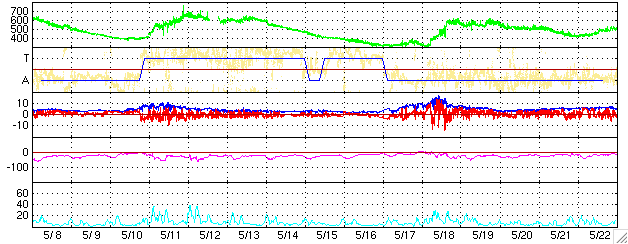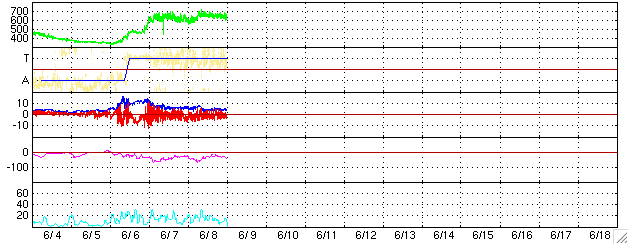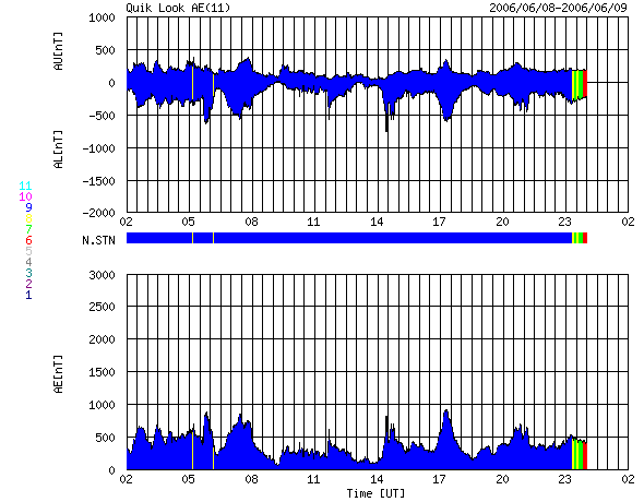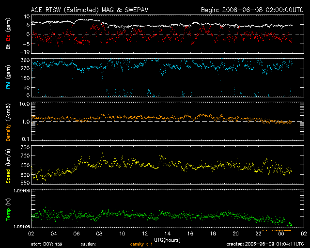 2006/ 6/ 9 10:05 更新 コロナホールによる高速の太陽風が続いています(650km/秒)。892黒点群がやや発達しています。 担当 篠原 650mk/秒と高速の太陽風が続いています。 昨日のニュースの頃は、600km/秒を切って、下がり始めた雰囲気だったのですが、 その後、8日15時(世界時8日6時)頃に再び650km/秒に盛り返し、 現在まで650km/秒前後を保っています。 磁場強度は5nT。 南北成分は細かく振動していて、+3nTから-3nTの間を頻繁に変化しています。 そして、中規模のオーロラ活動が活発に続いています。 500〜800nTの活動が頻繁に一日中発生しています。 速度は高いものの、磁場強度が弱まって、南向き成分も小さな振幅になっています。 このため、大きなオーロラ活動には発達していないのでしょう。 再び盛り返した高速風ですが、この後はゆっくりと速度が低下して行くでしょう。 今日から明日いっぱいくらいは500km/秒台が続くかもしれません。 その後ゆっくりと下がって、穏やかな太陽風に戻って行きます。 放射線帯の高エネルギー電子は、一気に警戒ライン(10の4乗)に達しています。 衛星の運用では障害が発生しやすい状態になっています。 高エネルギー電子は、引き続き上昇を続ける可能性があります。 今後の変化に注意してください。 密度の上昇はすぐなのですが、減少するのは1週間近くかかることもあります。 警戒状態はしばらく続くと思われます。 太陽では、892黒点群がやや発達している様です。 X線の動画を見ていると、とても小さな活動ですが活発さを増しています。 また、磁場構造も複雑さを増しているそうで、注目されます。 (ただし、NOAA/SECの予報ではフレアに対する警戒度は下がっていました) これからどのようになるでしょうか。 893黒点群は、黒点の規模がやや増しています。 フレア活動はほとんどなく、こちらは静穏な印象です。 GOES衛星のX線カメラで撮影した太陽の様子。コロナホールを見るために強調処理をしている。9日09時 (世界時9日00時)。 (c) NOAA/SEC ![]() ACEが観測した太陽風の磁場(1番上の枠、白線は全体の強度、赤線は南北成分) および、太陽風の密度(3番目の橙線)、速度(4番目の黄線) (c) NOAA/SEC ![]() リアルタイムAE指数 下段のAEグラフの値が高くなると、オーロラ活動が活発化しています。 (c) 京都大学, NICT ![]() 沖縄の磁場擾乱 下へ下がるほど、擾乱が発達している事を意味します。 (c) NICT ![]() 27日の太陽周期に合わせたデータプロット (太陽風版) 太陽が同じ面を地球に向けていた27日前の変化から、今後を予想することができます。 (c) NICT